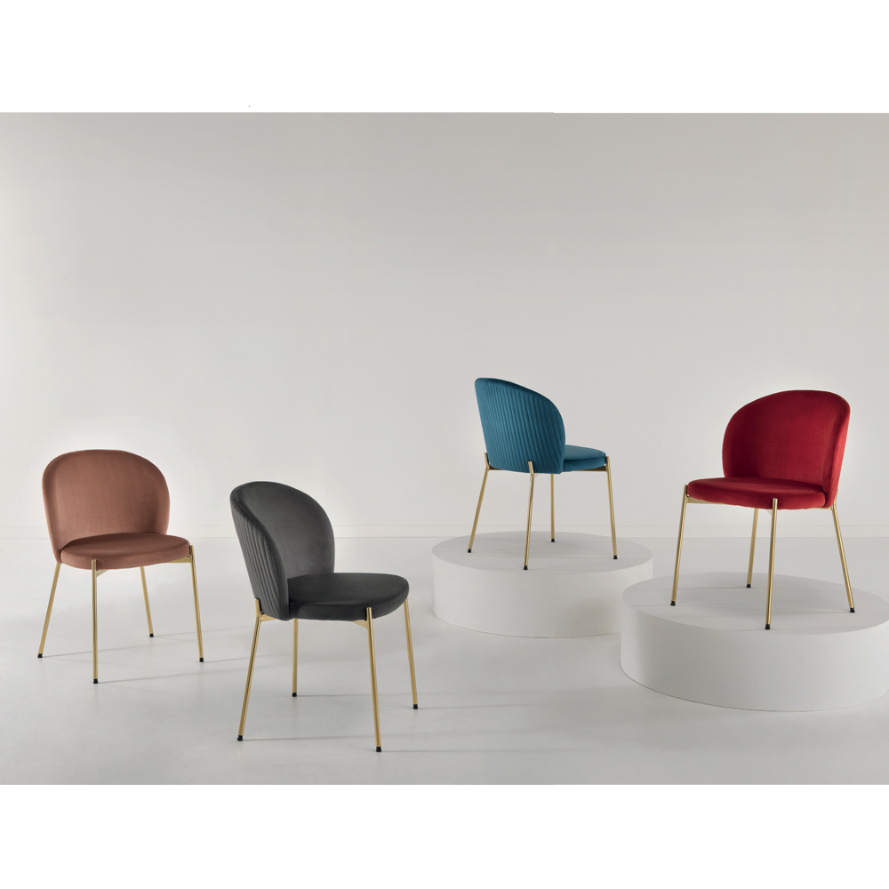 Scaun de sufragerie cu sezut captusit imbracat in catifea si structura metalica aurie . O piesa de mobilier cu un stil esential revizuita intr-o cheie contemporana pentru a da viata unui scaun original prin combinatia de materiale si culori moderne si inovatoare . Rezultatul este o soluție de amenajare unică, care îmbină funcționalitatea și versatilitatea pentru a mobila cu personalitate spațiile de acasă.