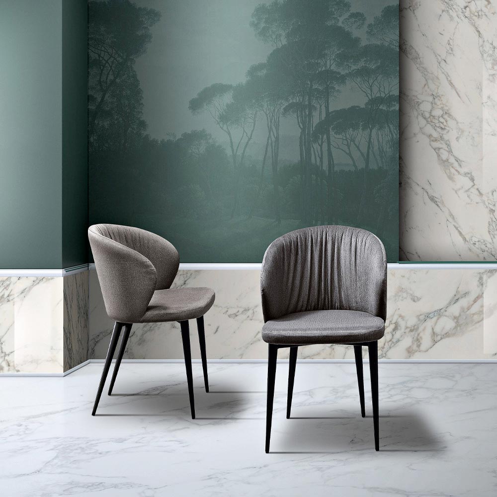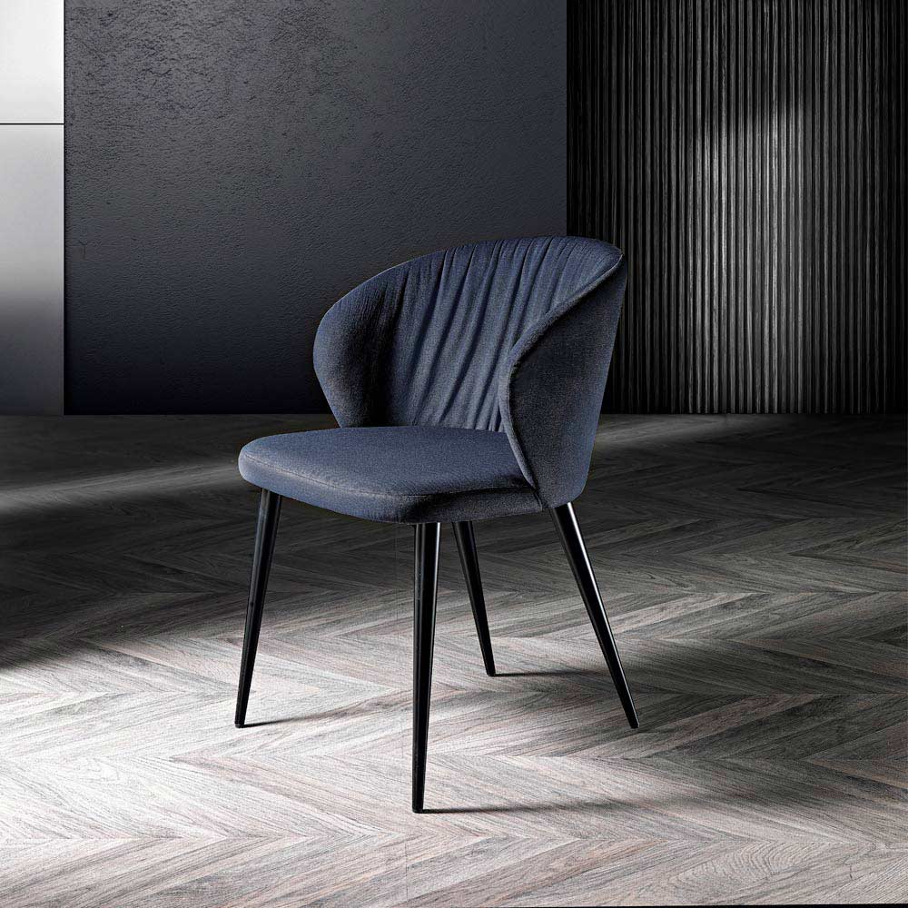 Scaun de cadă cu design modern îmbrăcat în țesătură colorată și picioare conice din metal, fabricat în Italia.