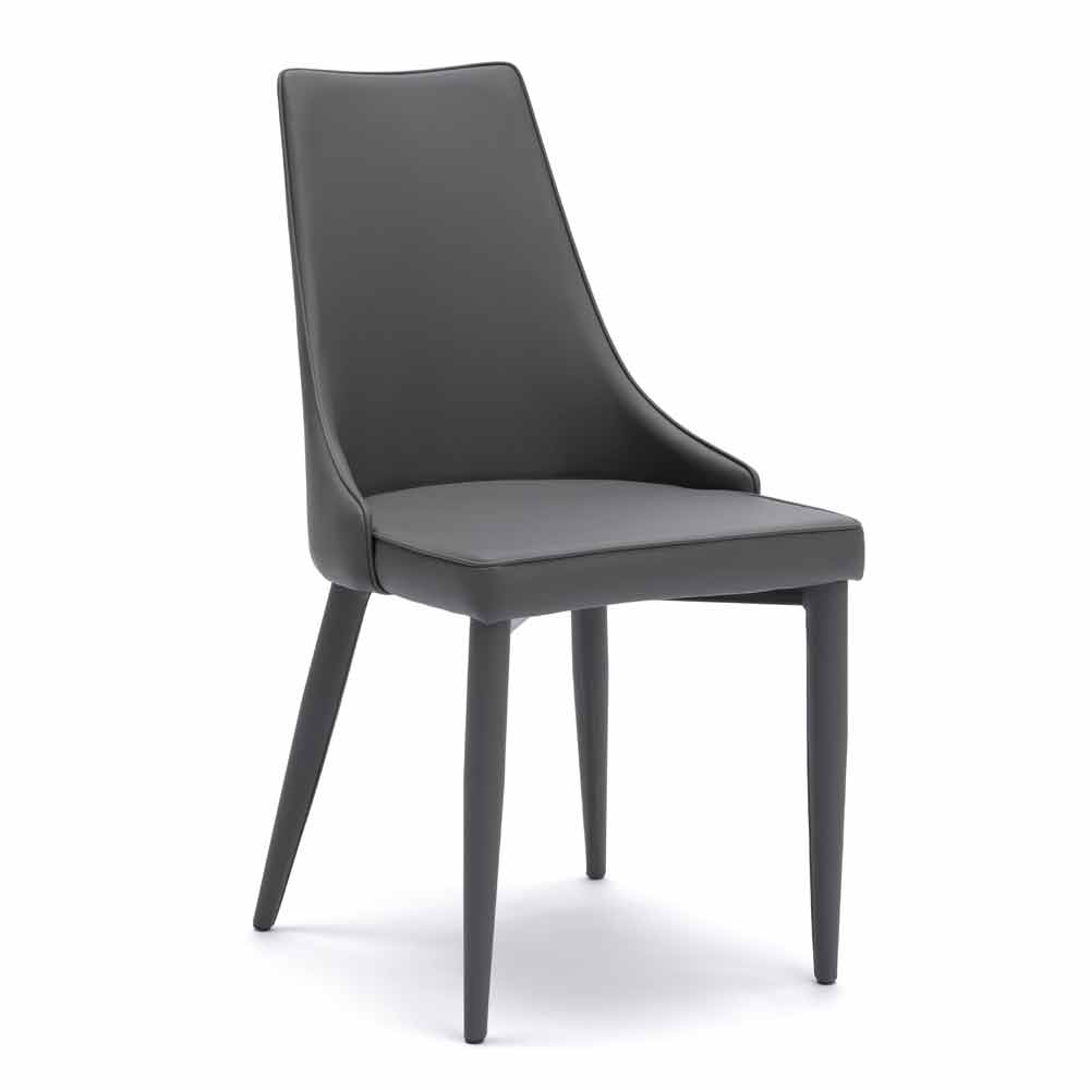 Scaun cu cadru metalic acoperit complet în imitație de piele gri închis.