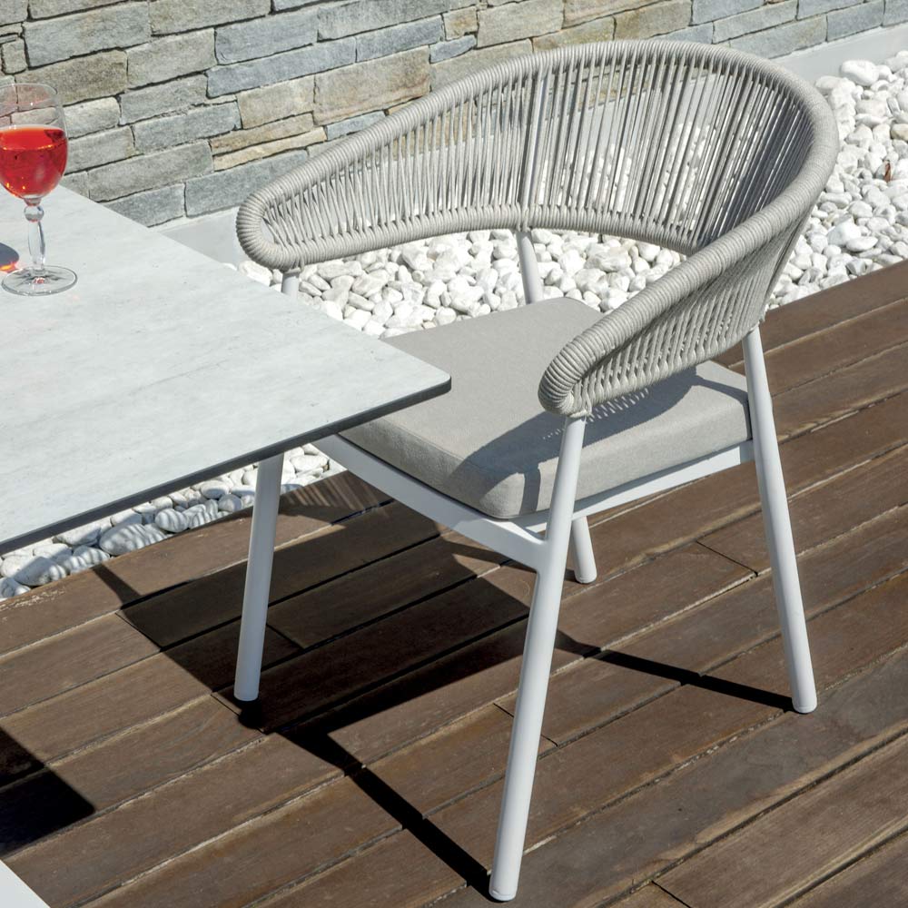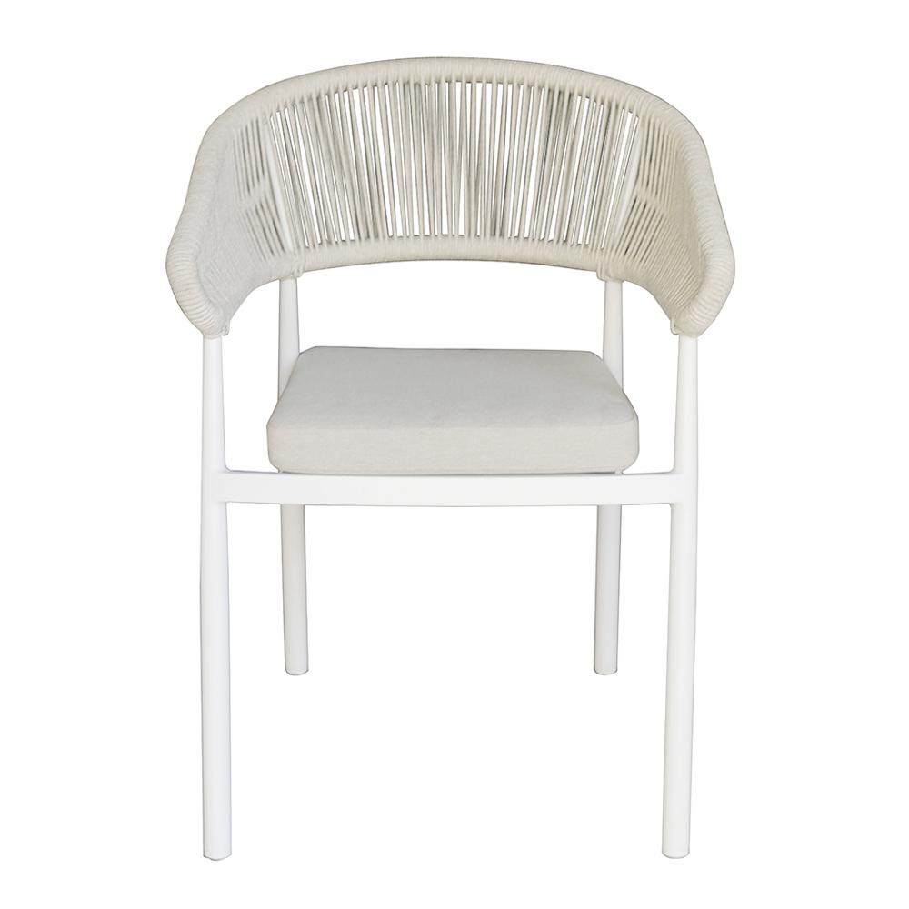 Dați o notă de stil sofisticat și caracter practic mediilor dvs. exterioare cu acest scaun cu design modern. spatele din frânghie adaugă un element de eleganță artizanală, în timp ce scaunul cu lamele din aluminiu oferă rezistență și confort, făcându-l ideal pentru utilizarea zilnică.