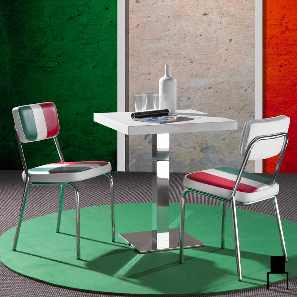Scaun din piele ecologică cu pavilion italian de design Banda Scaune Banda cu un design unic și original. Fiecare scaun încorporează stilul anilor 50 cu designul său, pe lângă memoria națiunii italiene. Banda este formată dintr-o structură cromată, acoperită cu piele de graffiti în finisaj, care amintește steagul italian. Banda este un scaun cu un design simplu și elegant, scaunul său garantând un confort unic. În designul Banda și simplitatea sunt combinate, acestea sunt rezultatul unor materiale simple, care se combină cu designul sinuos și elegant pentru a crea produse cu un design original.