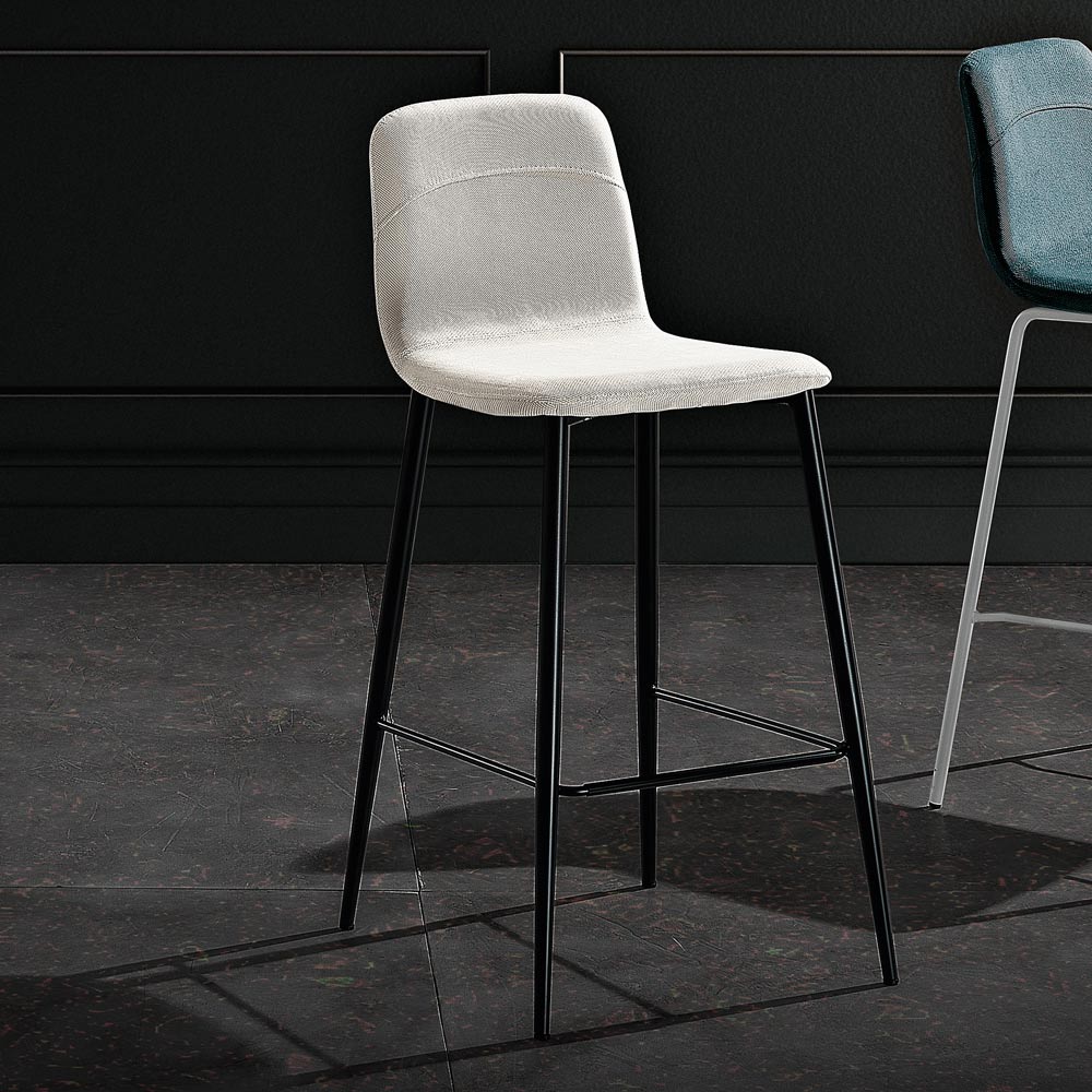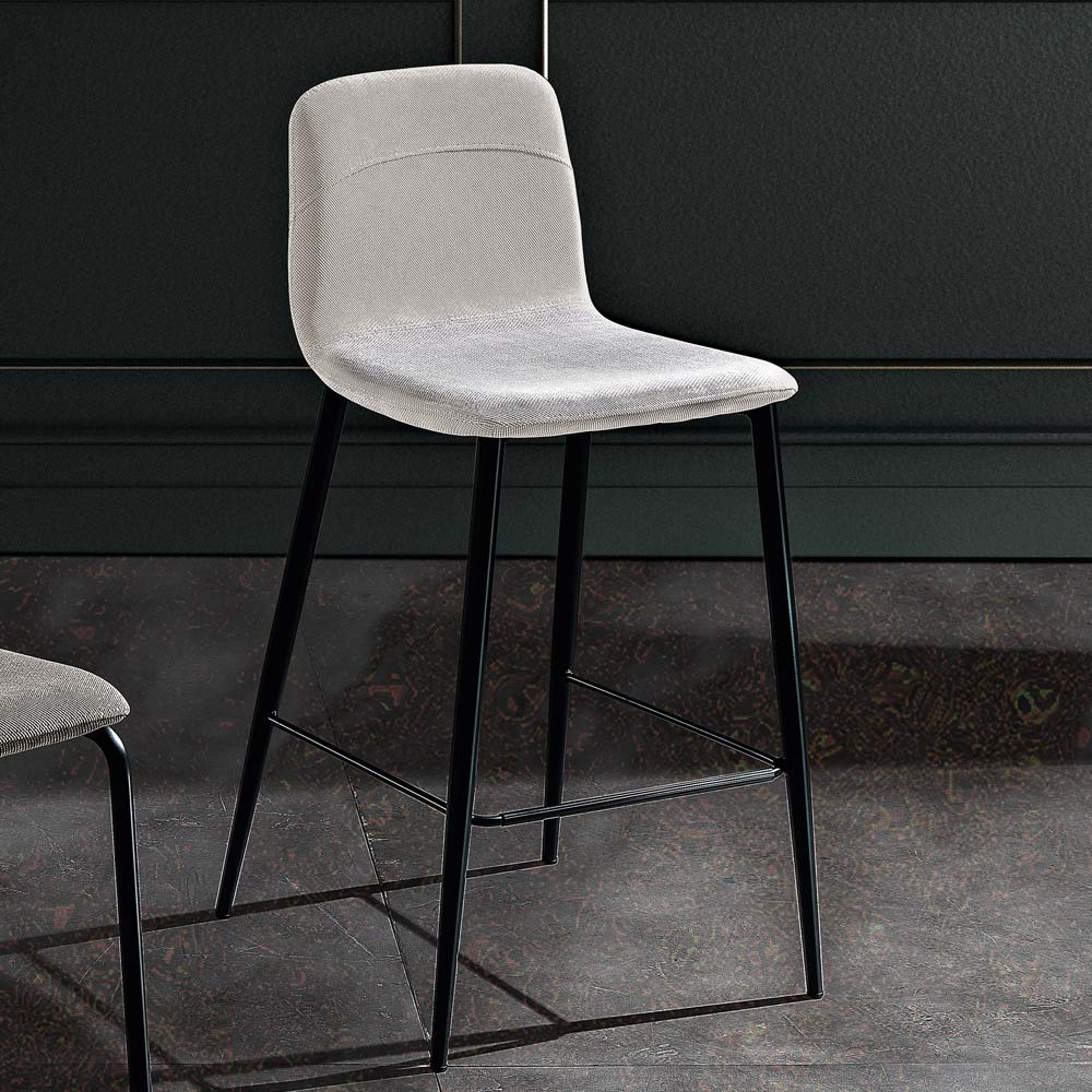 Scaun de bucatarie cu sezut imbracat in stofa si cadru metalic cu tub rotund (diametru 16 mm) in finisaj antracit mat RAL 7021 complet cu suport practic pentru picioare, fabricat in Italia.