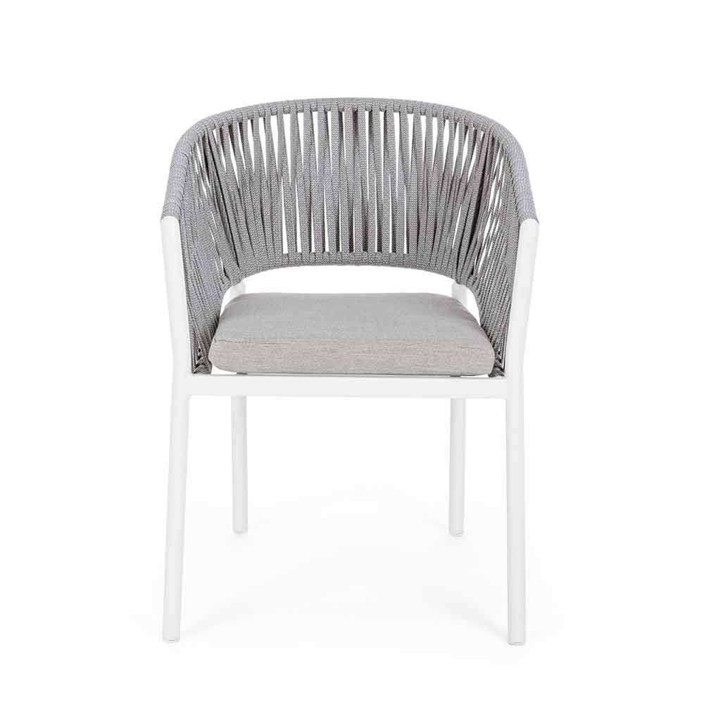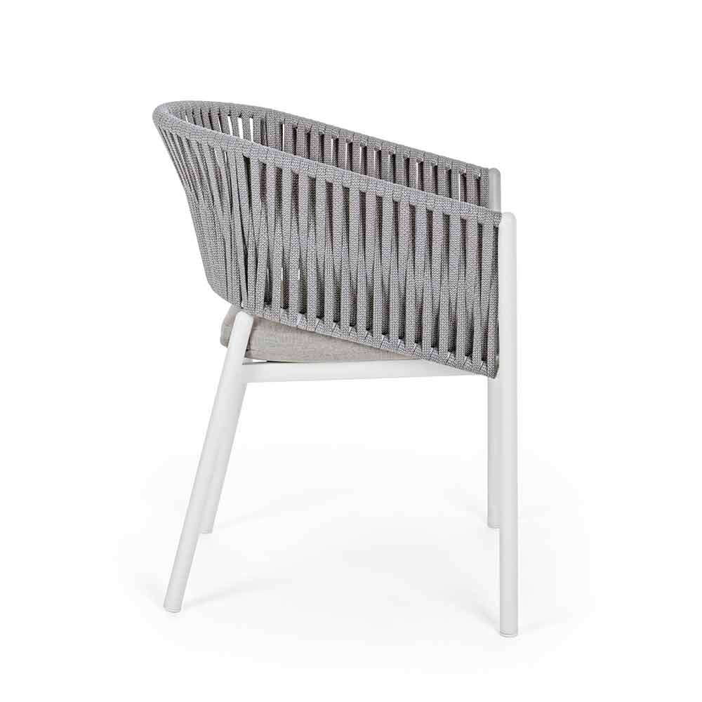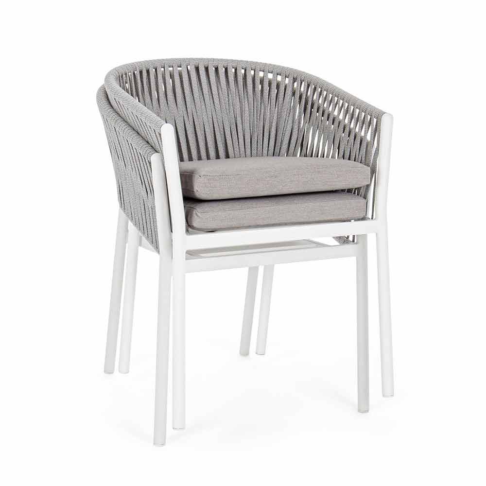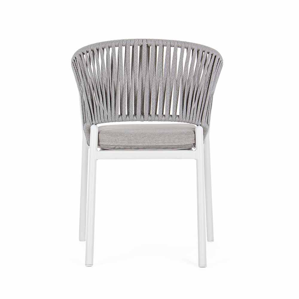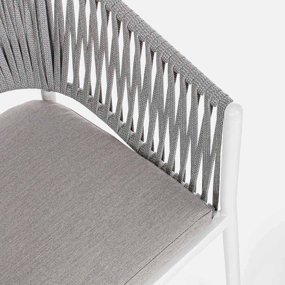 Scaun de exterior modern din aluminiu alb cu țesătură cu funie și pernă, design, stivuitor.