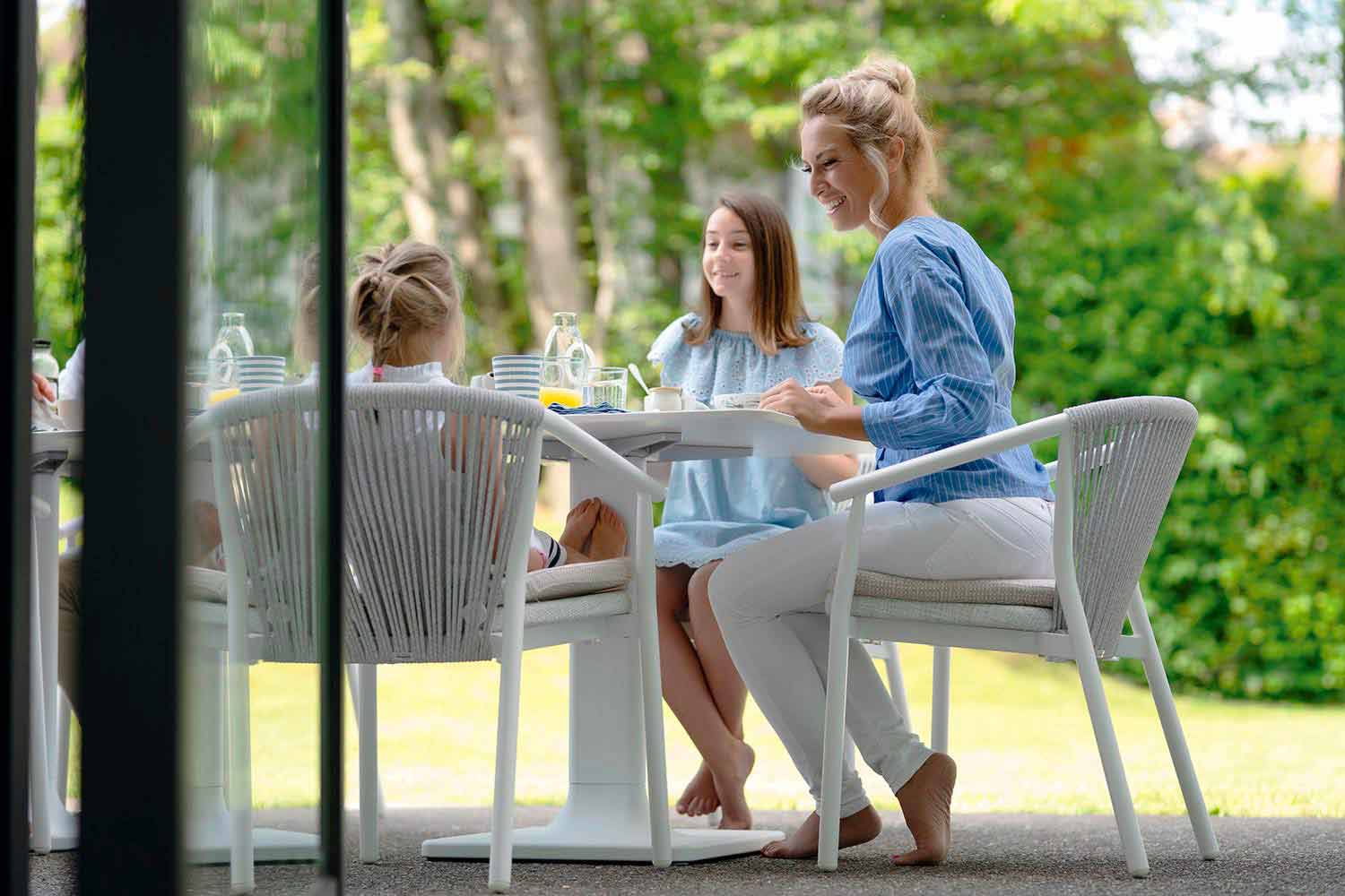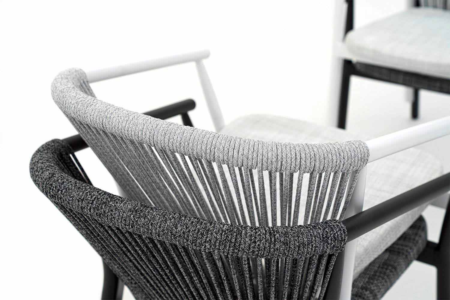 Scaun de grădină stivuitor de înaltă calitate, cu cotiere de 78 cm înălțime, cu bază de aluminiu și scaun în țesătură tehnică cu pernă captusită.