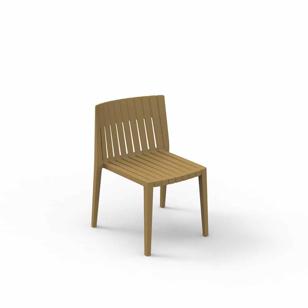 Scaunul exterior fără brațe, cu linii definite, este fabricat din polipropilenă și fibră de sticlă. Aceste materiale sunt rezistente la impact și stabilizatoare UV.
