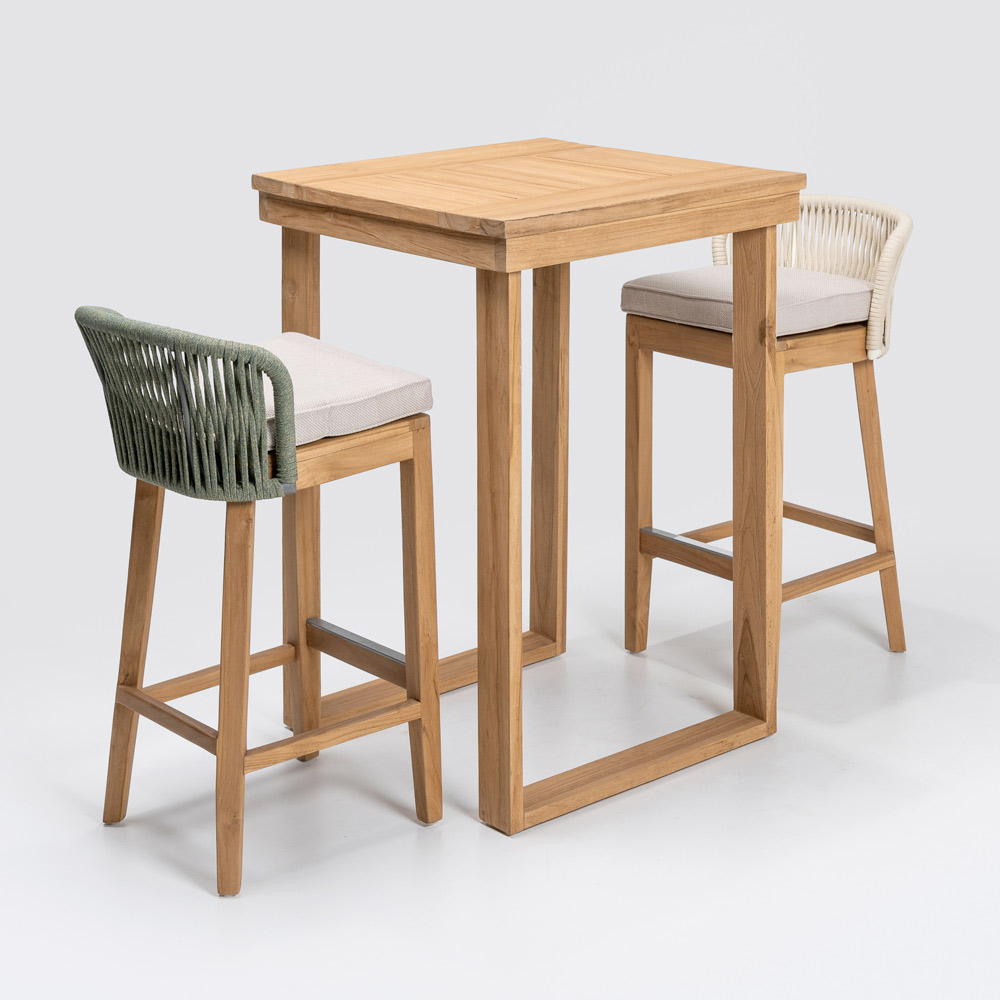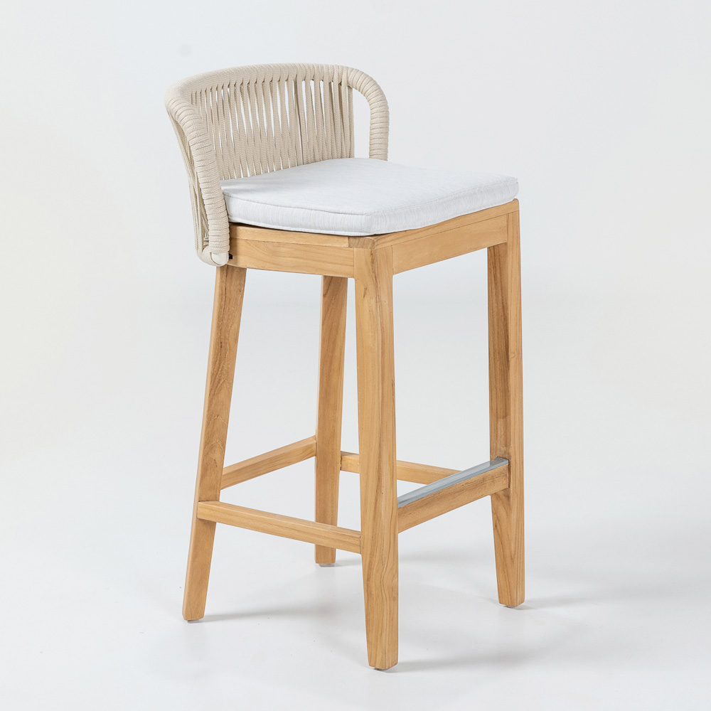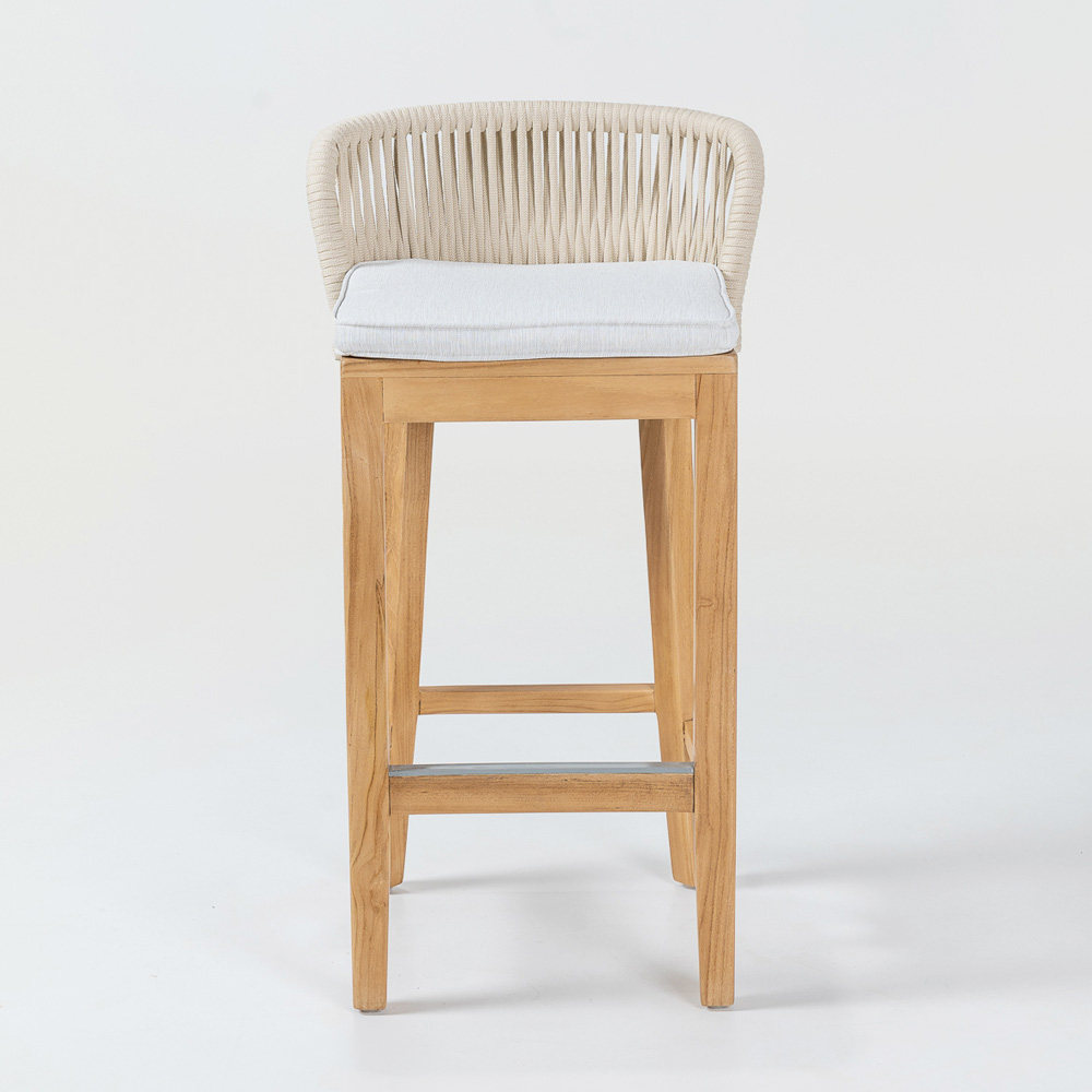 Elegant și versatil, acest scaun de bar are o structură din lemn natural de tec și aluminiu , asigurând combinația perfectă de rezistență și ușurință . Perna din material textil gri Havana oferă un confort excelent, în timp ce țesătura din frânghie Olefin/PP nu numai că adaugă o notă de sofisticare , dar este și rezistentă la intemperii, fiind ideal atât pentru utilizare în interior, cât și în exterior.