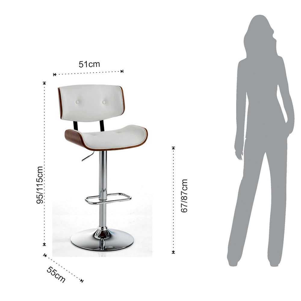 Scaun inalt de bucatarie cu baza din metal cromat complet cu suport practic pentru picioare si sezut si spatar din placaj vopsit cu finisaj nuc si piele sintetica alba. Particularitatea sa este reprezentată de liftul practic cu gaz reglabil care vă permite să personalizați înălțimea scaunului până la maximum 87 cm. Designul său este unic și captivant și este punctat de forme moi și linii rotunjite care asigură un scaun confortabil și primitor, deci ideal pentru completarea mediilor domestice precum bucătăriile sau sălile de mese dar și barurile și restaurantele cu stil modern. Combinația minunată dintre atingerea impunătoare a lemnului și eleganța atemporală a pielii dă viață unui complement original , avangardist, cu o puternică personalitate contemporană .