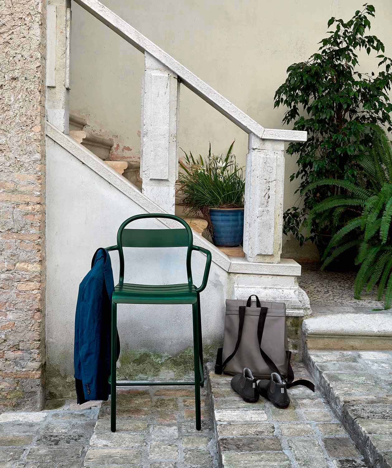 Scaun înalt din aluminiu vopsit, stivuitor în aer liber Fabricat în Italia, 2 bucăți.