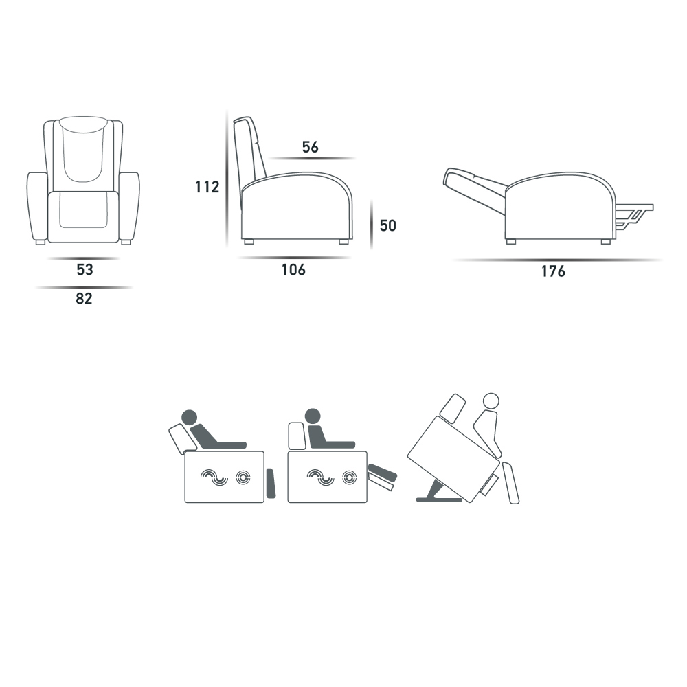 - Vibro: Prin acțiunea unei plăci vibratoare, aceasta masează membrele inferioare, stimulând decongestionarea picioarelor și promovând circulația sângelui. Ridicarea suportului pentru picioare și înclinarea completă a spătarului sporesc efectele benefice ale acestui tip de masaj și îi amplifică efectele.