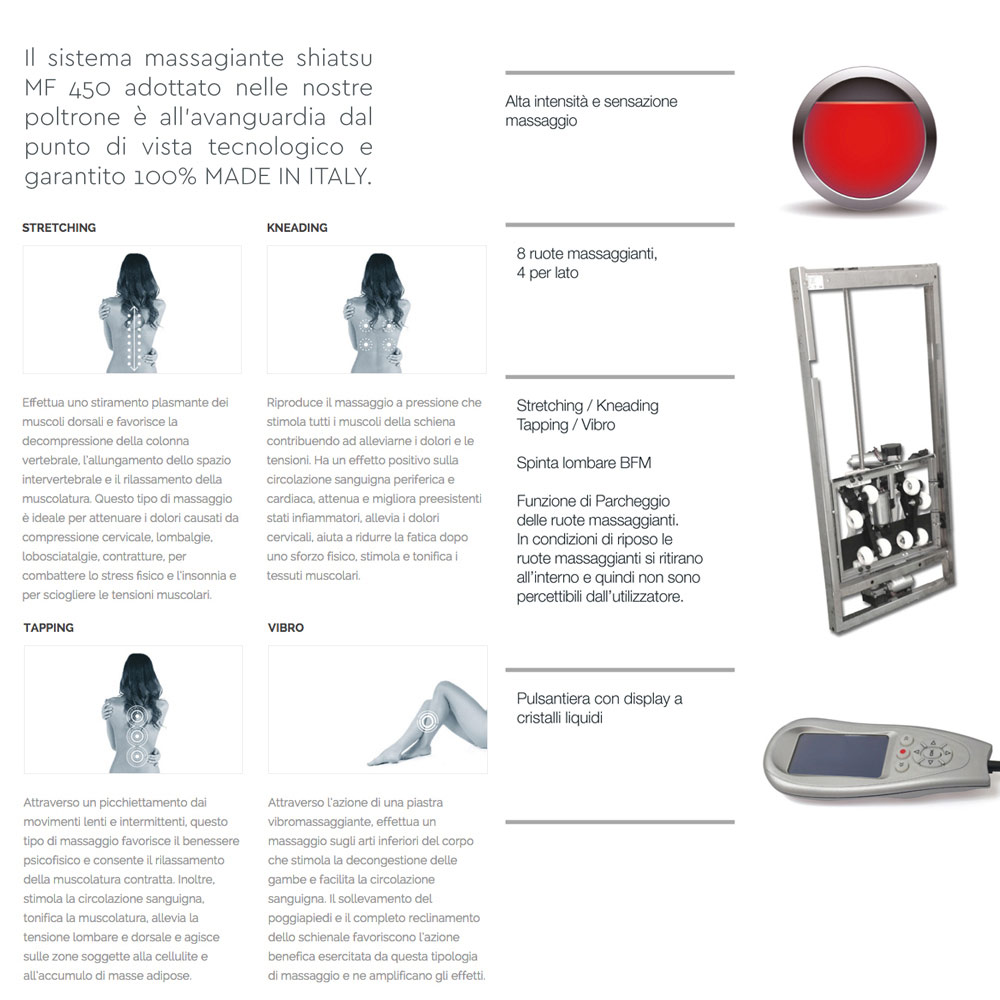 Fotoliul de relaxare Bria dispune și de masajul Shiatsu MF450 , un tip de masaj folosit pentru a îmbunătăți circulația sanguină și limfatică, generând liniște interioară și bunăstare fizică. Sistemul de masaj dispune de un mecanism cu două brațe echipate cu roți de masaj montate pe șine care alunecă de-a lungul contururilor spatelui, oferind un masaj constant și uniform pe întreaga suprafață dorsală. Sistemul de masaj Shiatsu MF450 este de ultimă generație din punct de vedere tehnologic și este garantat 100% fabricat în Italia .