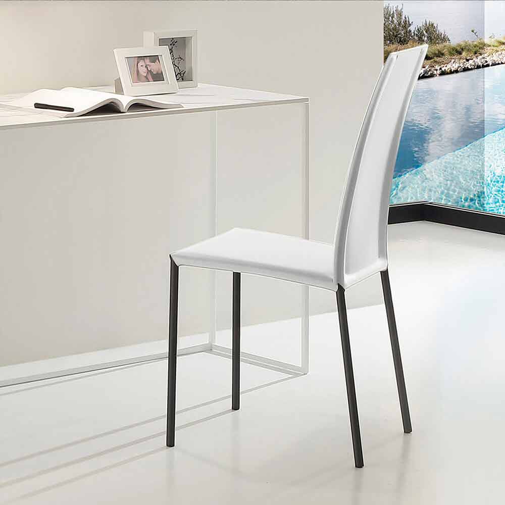 Un complement cu un design simplu și esențial îmbogățit și completat de combinația minunată dintre atingerea de clasă a acoperirii și modernitatea incontestabilă a metalului vopsit. Spătarul înalt conferă scaunului o formă alungită îmbogățindu-l cu o estetică aproape regală datorită, de asemenea, unui plus de eleganță și rafinament dat de textura minunată a pielii, un material prețios și de înaltă calitate. Numeroasele culori disponibile împreună cu esențialitatea formelor sale îl fac, de asemenea, o soluție de mobilier deosebit de versatilă , capabilă să creeze o armonie perfectă cu elementele din jur, caracterizând astfel mediul.
