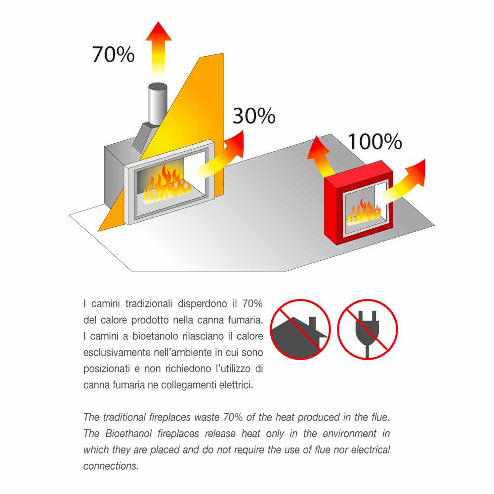 În plus, spre deosebire de șemineele tradiționale care dispersează 70% din căldura produsă în conducta de fum, în șemineele cu bioetanol, deoarece nu există conductă de fum sau conexiuni electrice, nu există dispersie de căldură, prin urmare, eficiența este de 100%.