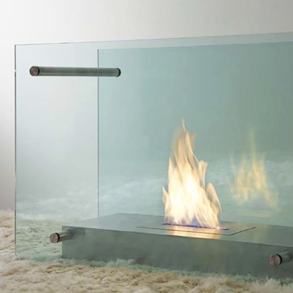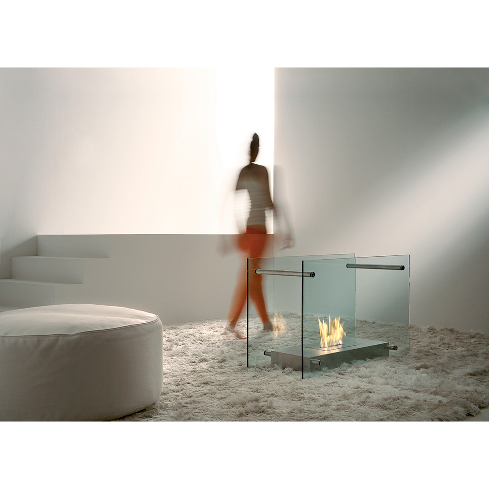 Șemineu cu bioetanol de podea cu un design modern din oțel și sticlă, pentru interior, fabricat în Italia.