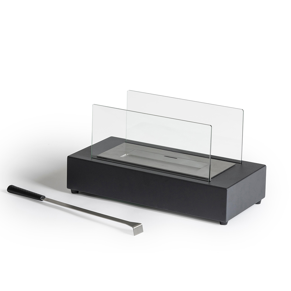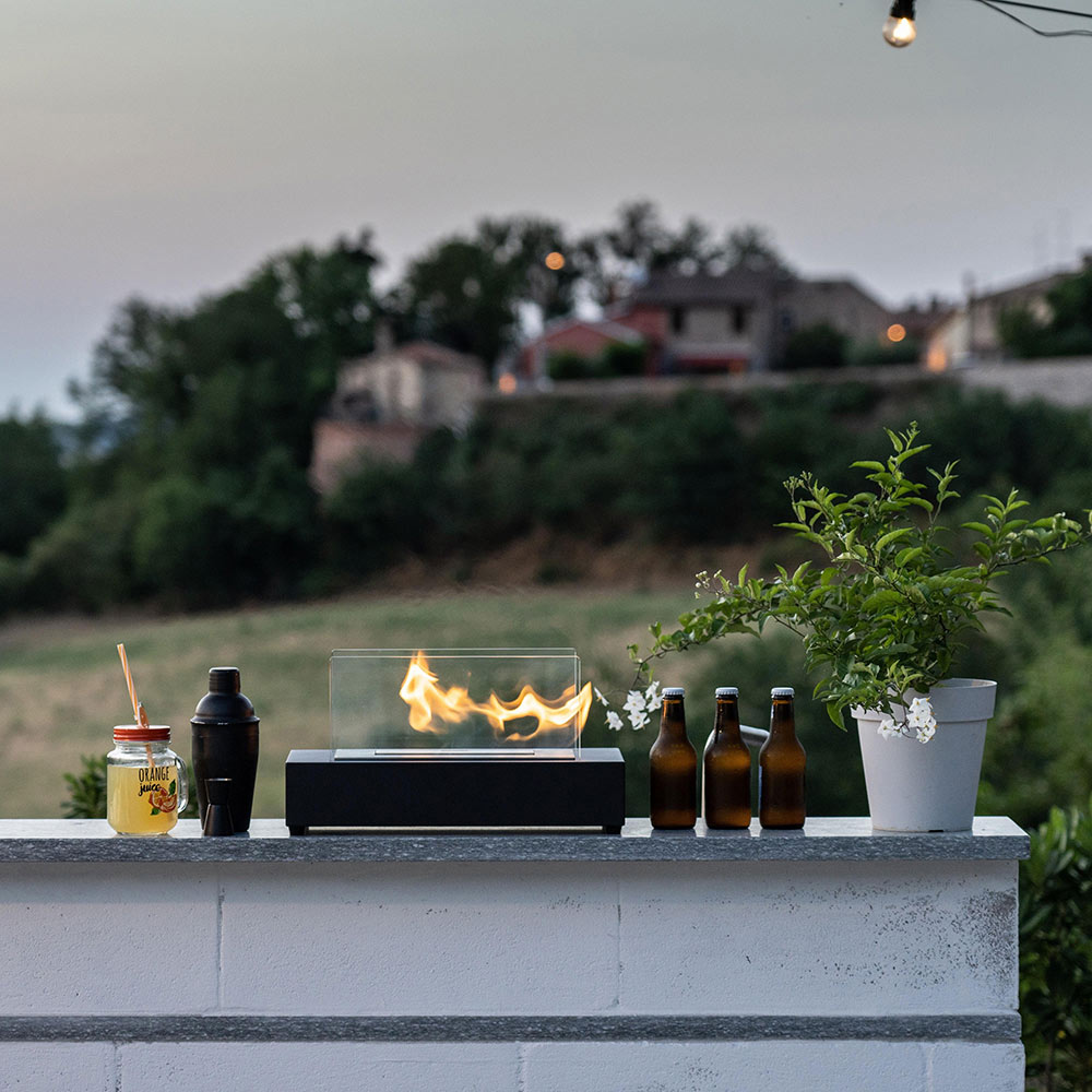 Biosemineu de podea sau de masa cu structura din metal vopsit negru si insertie transparenta din sticla securizata utila pentru protejarea flacarii de eventualele rafale de vant, evidentiind-o. Complet cu instrument de control al flăcării și manual de instrucțiuni. Un obiect cu dimensiuni reduse ideal pentru a incalzi mediile casnice si contract atat la interior cat si la exterior intr-un mod functional si elegant . Designul său exclusiv îl face de asemenea apreciabil atunci când este oprit deoarece completează spațiul înconjurător prin a notă de stil rafinat și elegant .