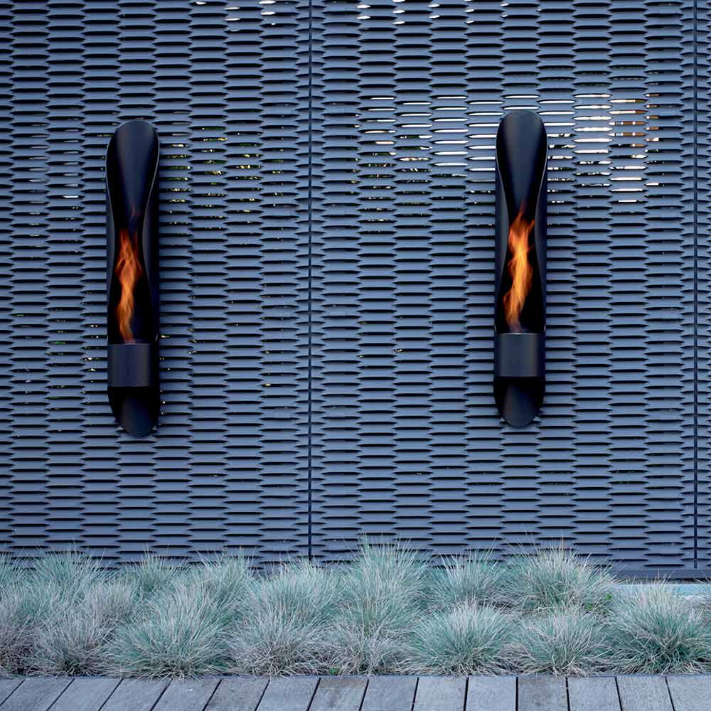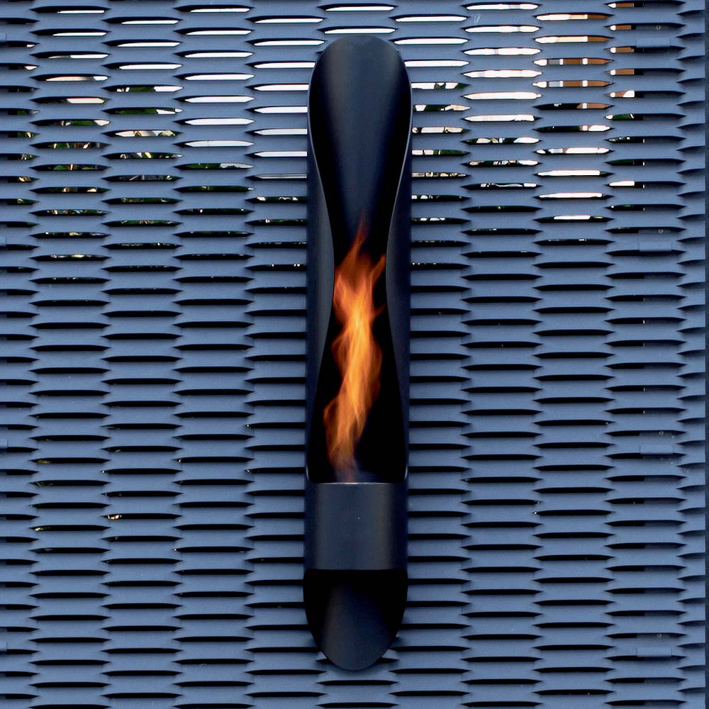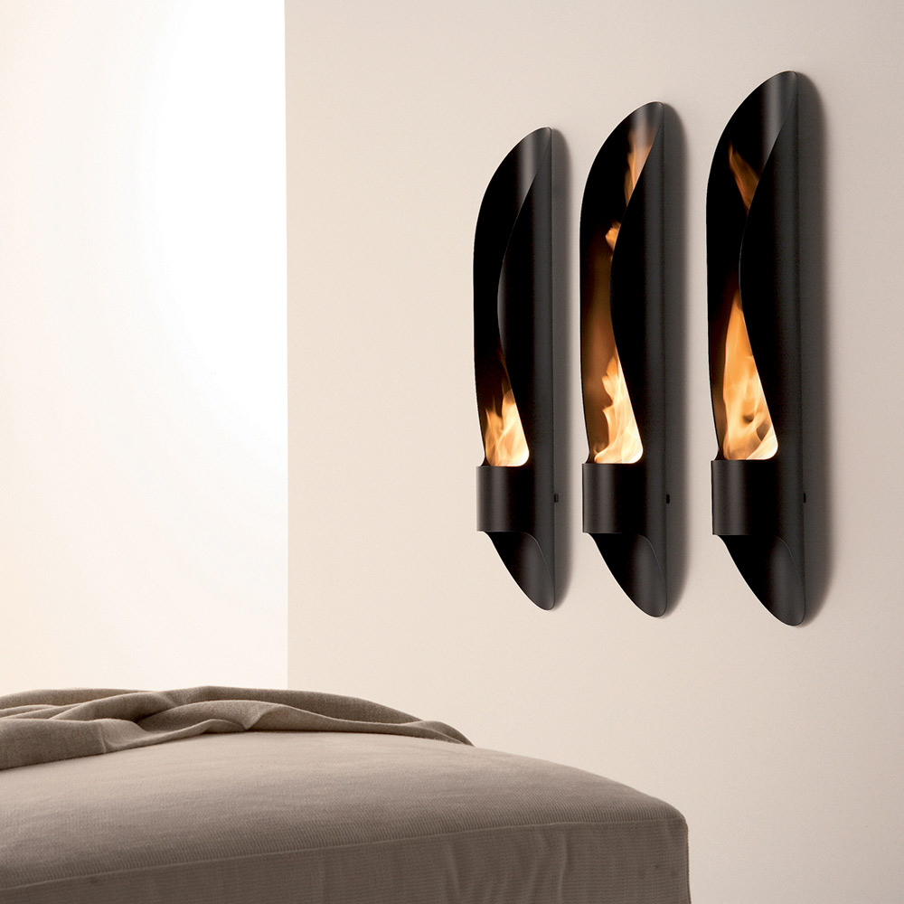 Șemineu de perete cu bioetanol, formă alungită, de design modern, din oțel negru, fabricat în Italia.
