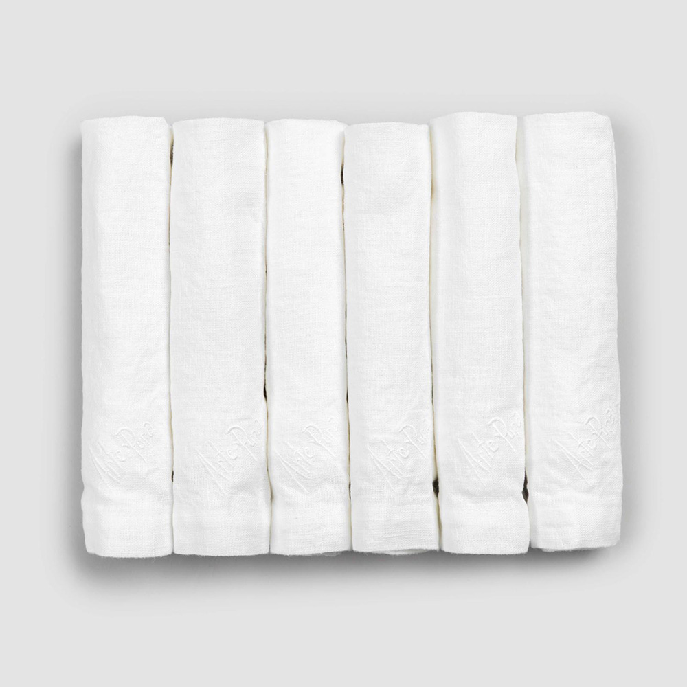 serviciu de 6 șervețele grele de in alb, cu margine pliabilă.