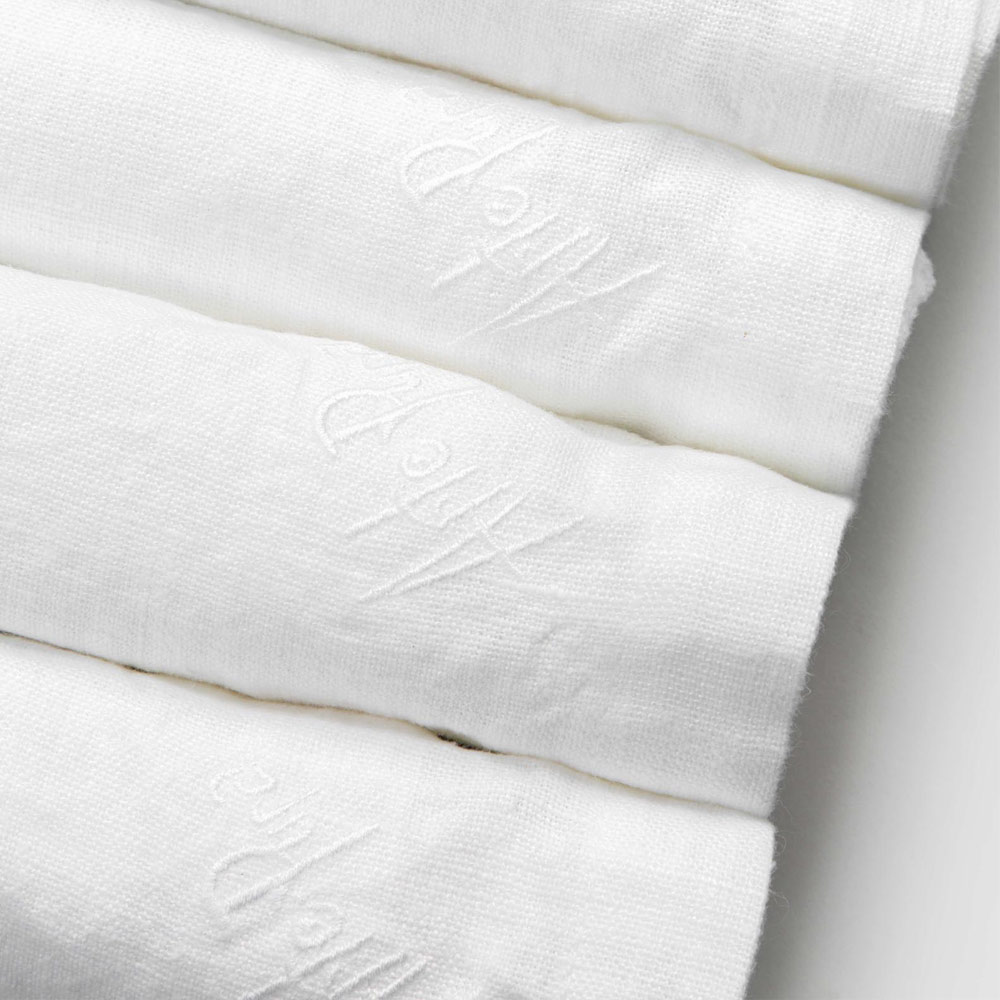 6 șervețele albe din in, cu margine pliabilă, lux și design elegant, fabricate în Italia.