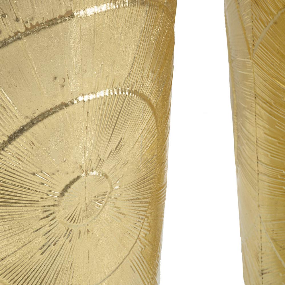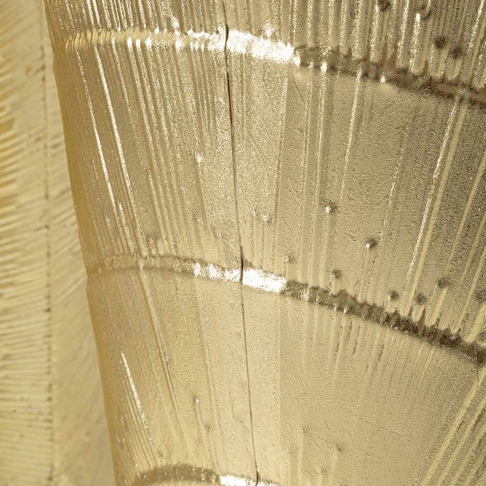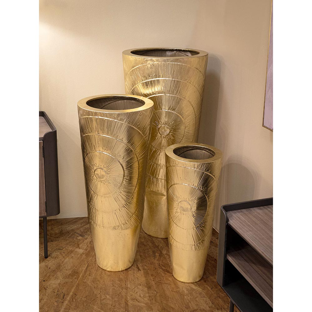 Aceste vaze decorative sunt adevarate sculpturi, opere de arta care capteaza privirea si imbogatesc elegant orice mediu. Tonul lor auriu creează un efect vizual cald și primitor, în timp ce liniile gravate în fier creează un efect radiant , care dă mișcare și viață suprafeței netede a vazelor.