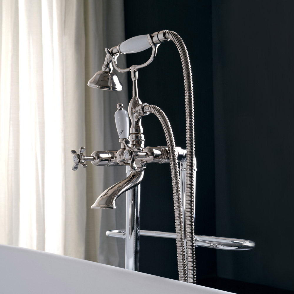 Set de cadă pe podea cuporți pentru prosoape, dușuritoaletă și furtun realizat din alamă grea, turnat în matrițe care respectă sistemele meșteșugărești din trecut și protejat cu un strat gros de finisare nichel.