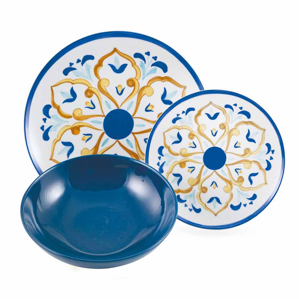 Serviciu de masă din porțelan și gresie de culoare albastru și galben, design modern din 18 piese.