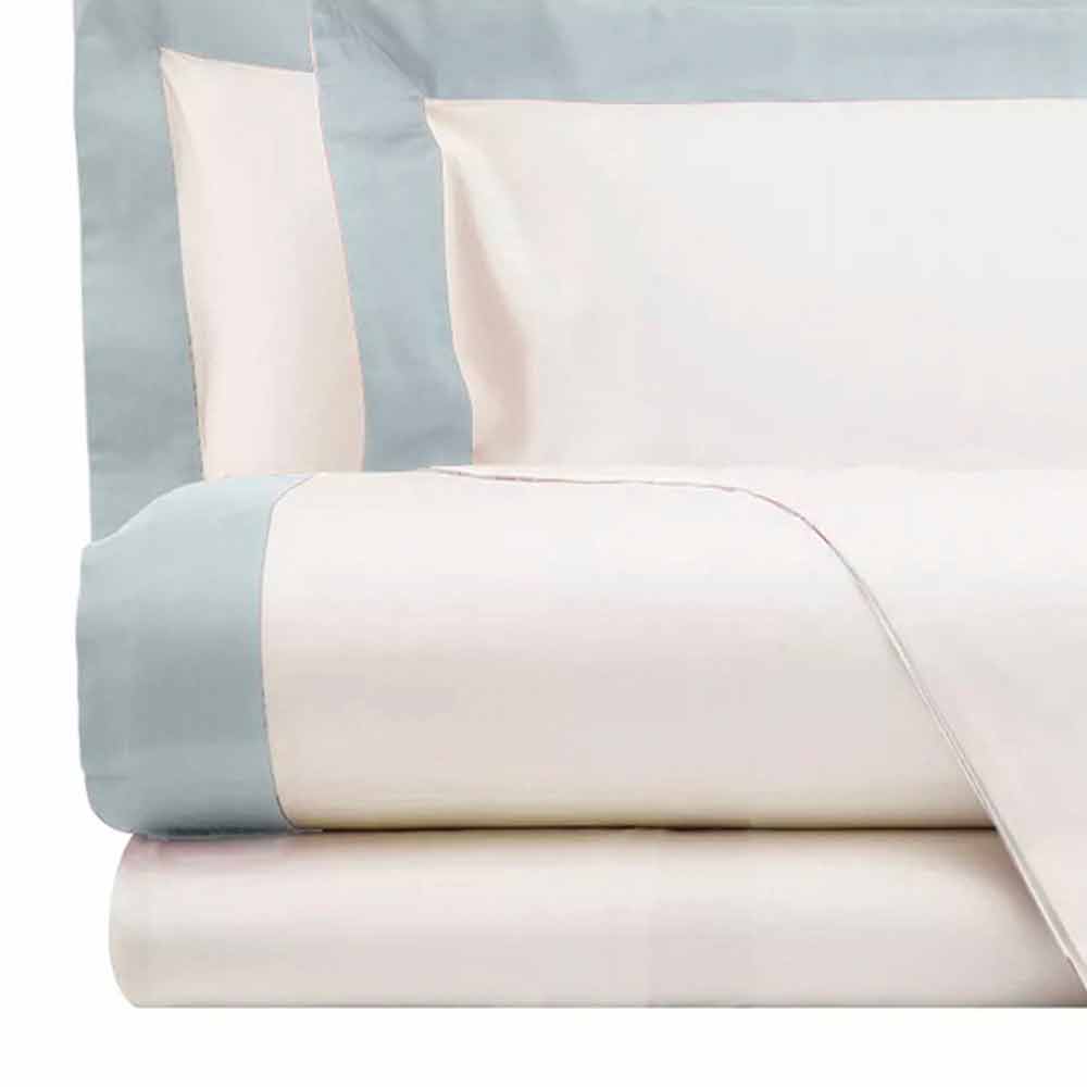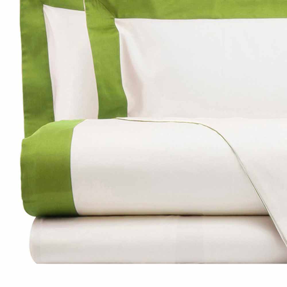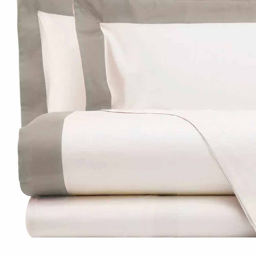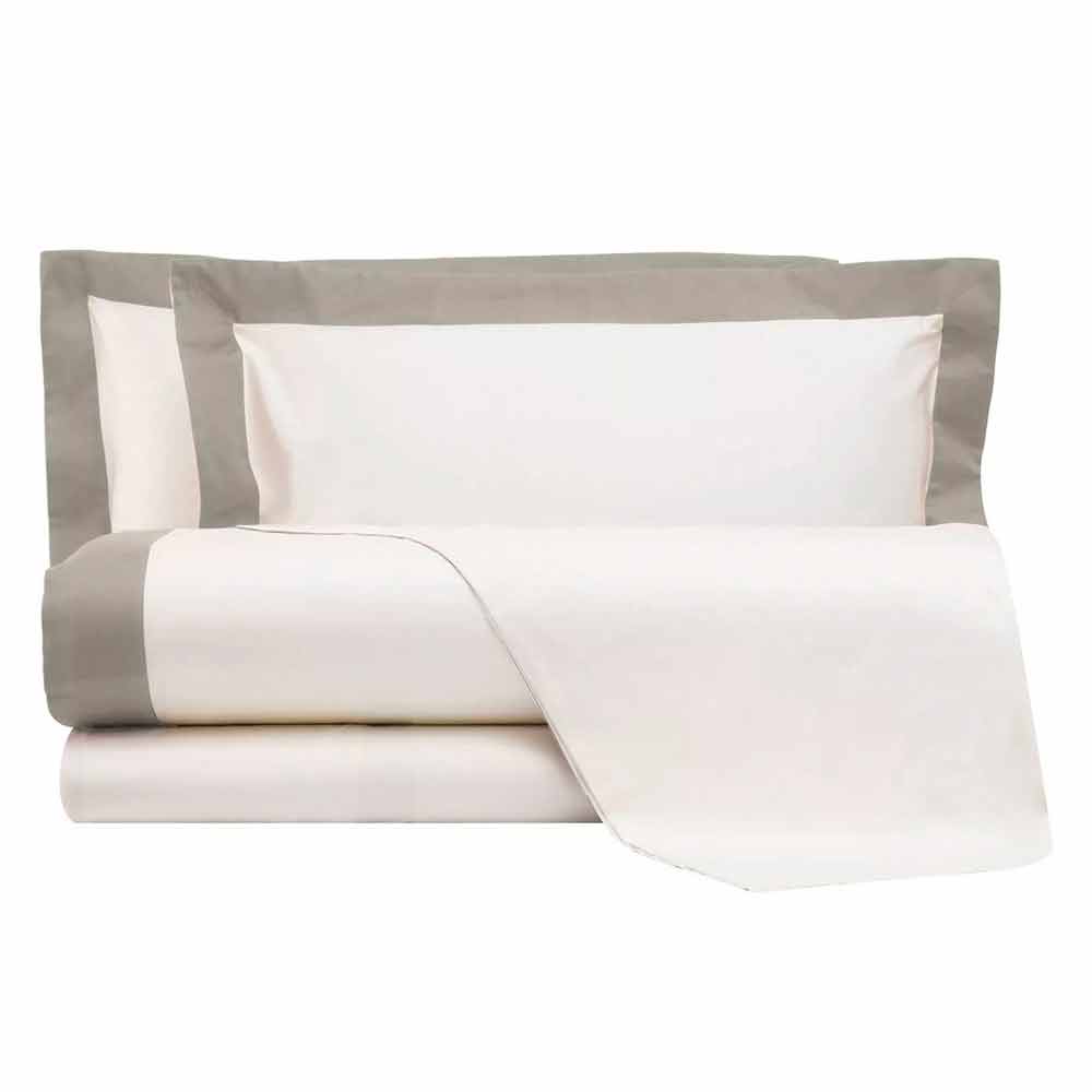 Complet cu foi de fildeș cu margine contrastantă de diferite culori pentru pat dublu din satin 200 TC realizat în Italia.