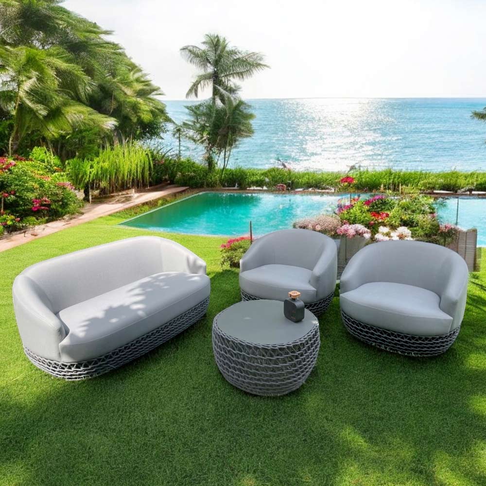 Completat cu o măsuță de cafea asortată cu aceeași țesătură decorativă, acest set de lounge este alegerea ideală pentru a crea o oază elegantă de relaxare , perfectă pentru grădini, terase și verande.