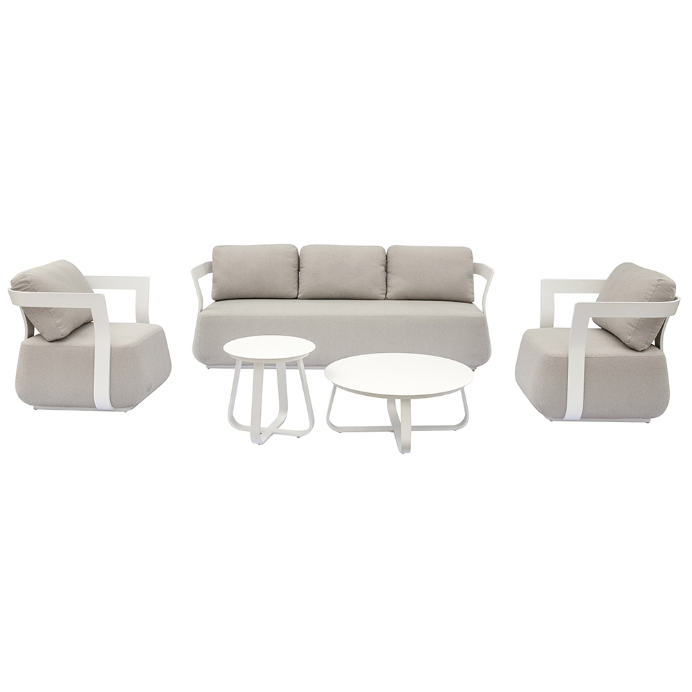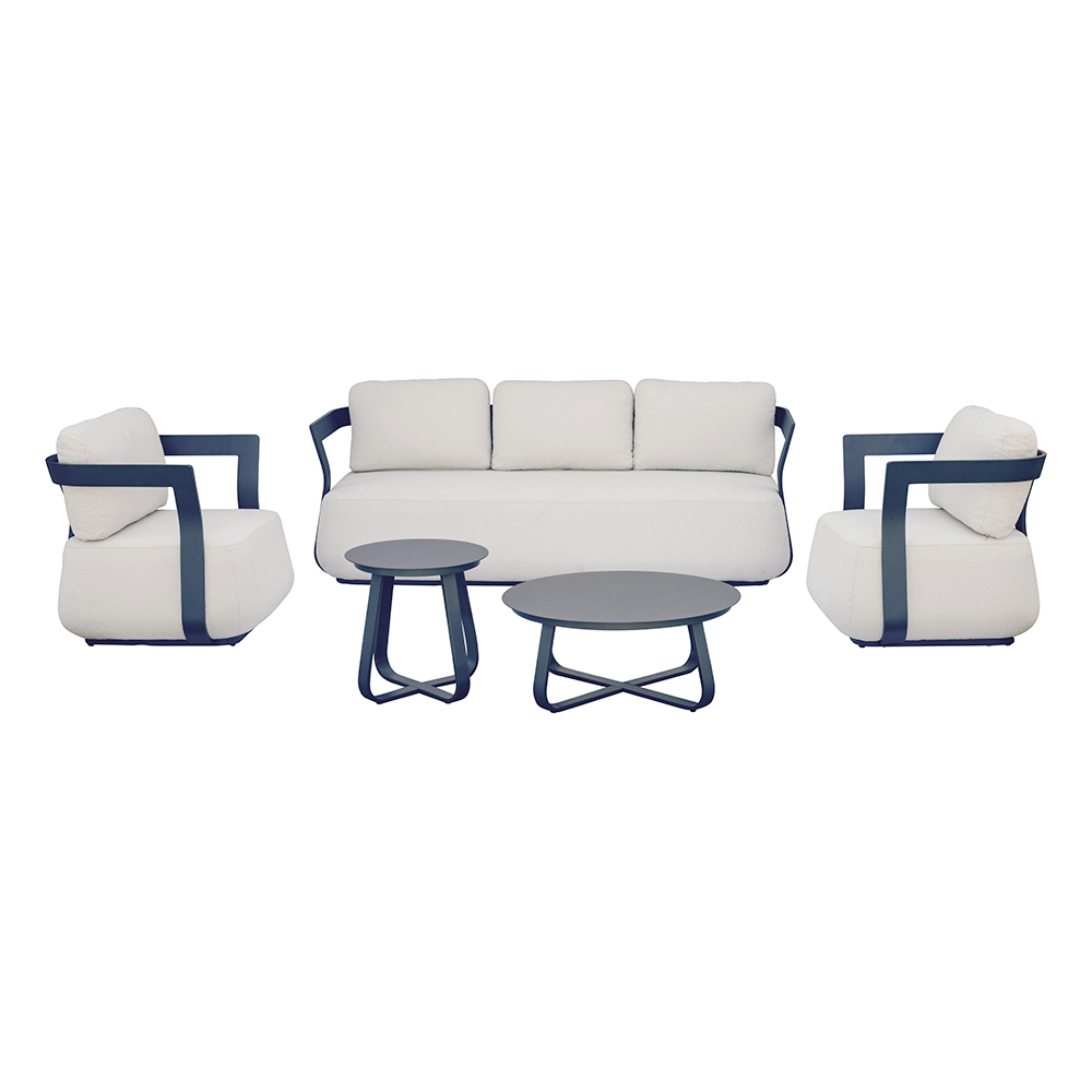 Acest set de mobilier de grădină este combinația perfectă între design modern, confort și materiale de înaltă calitate , conceput pentru a mobila spațiile exterioare cu stil și funcționalitate. Compus din două fotolii , o canapea cu trei locuri și două măsuțe de cafea cu blaturi din aluminiu , oferă o atmosferă primitoare și rafinată, ideală pentru relaxare în aer liber.