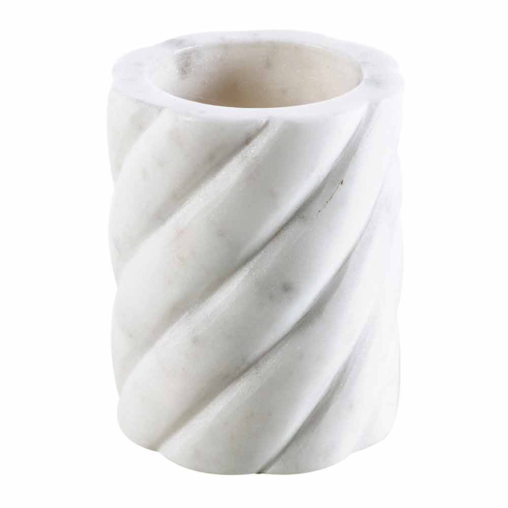 - accesorii baie: dozator diam. 7,5x18cm, sticla diam.8x10cm, sapuniera 10,5x2cm; toate cu lucrare răsucită din marmură Calacatta.