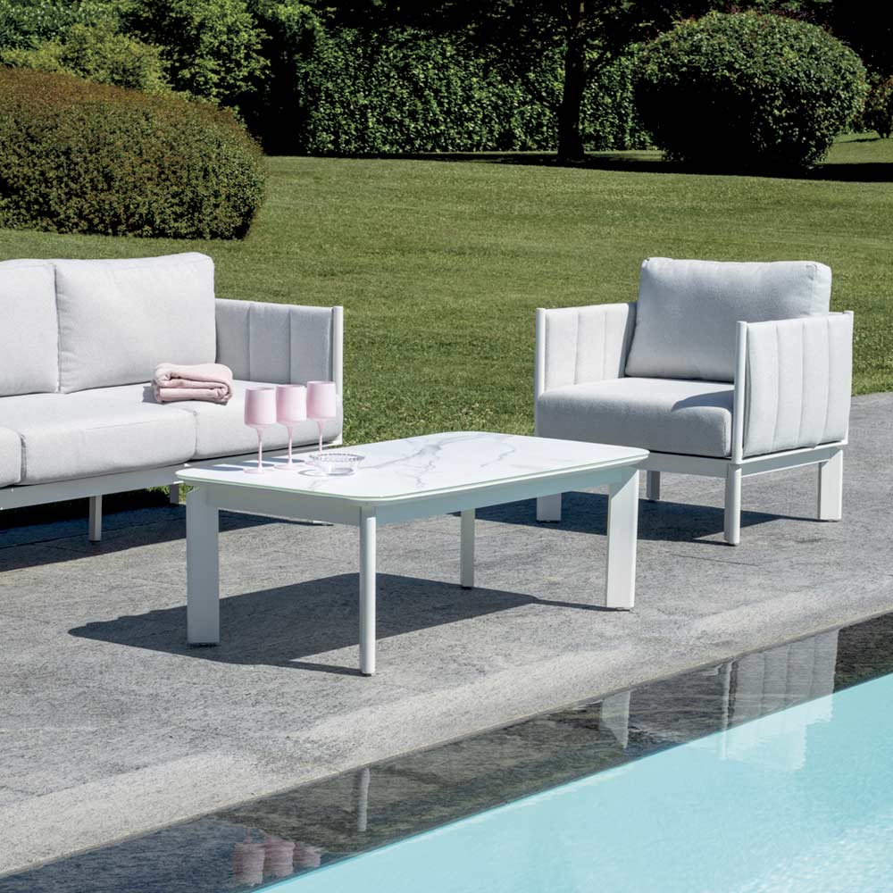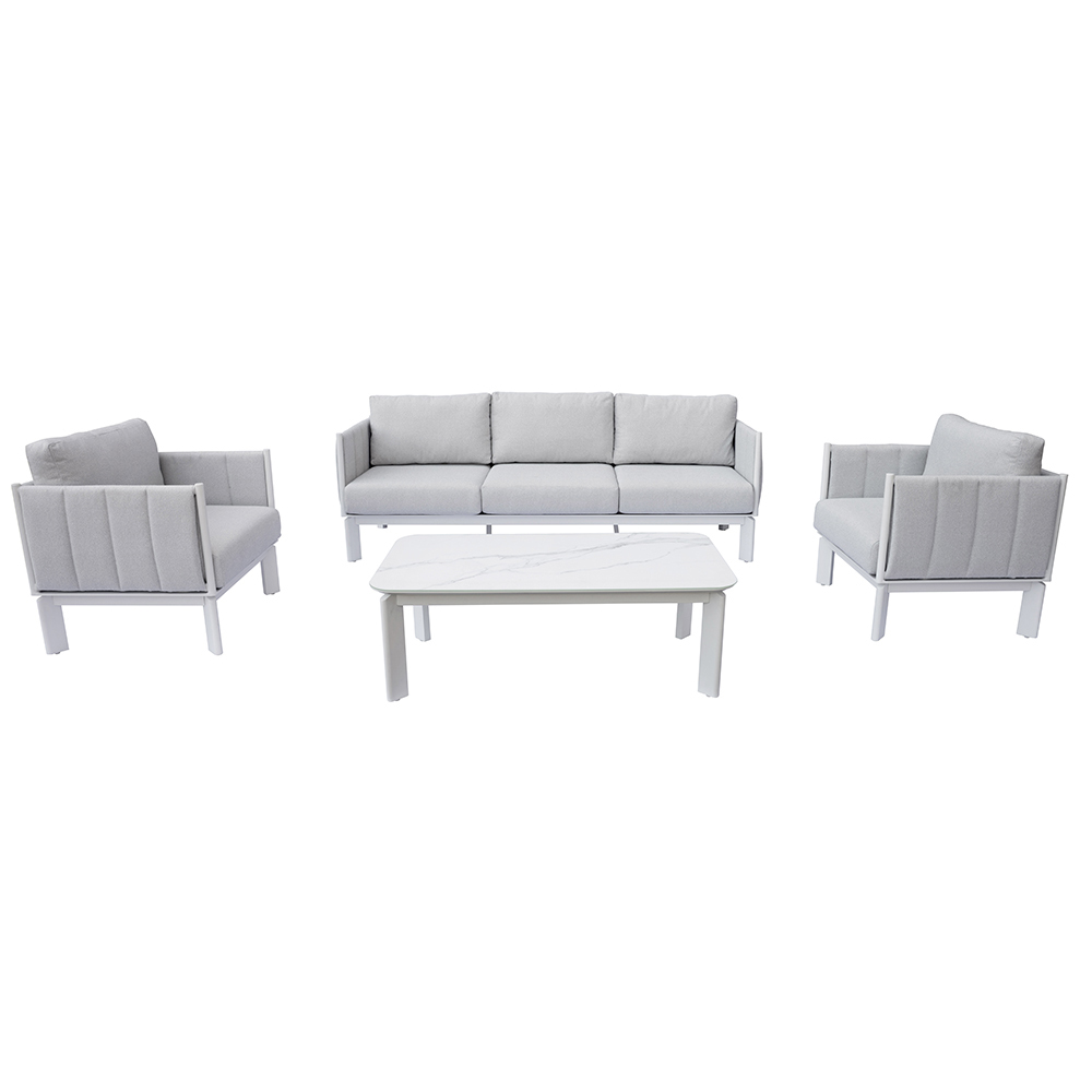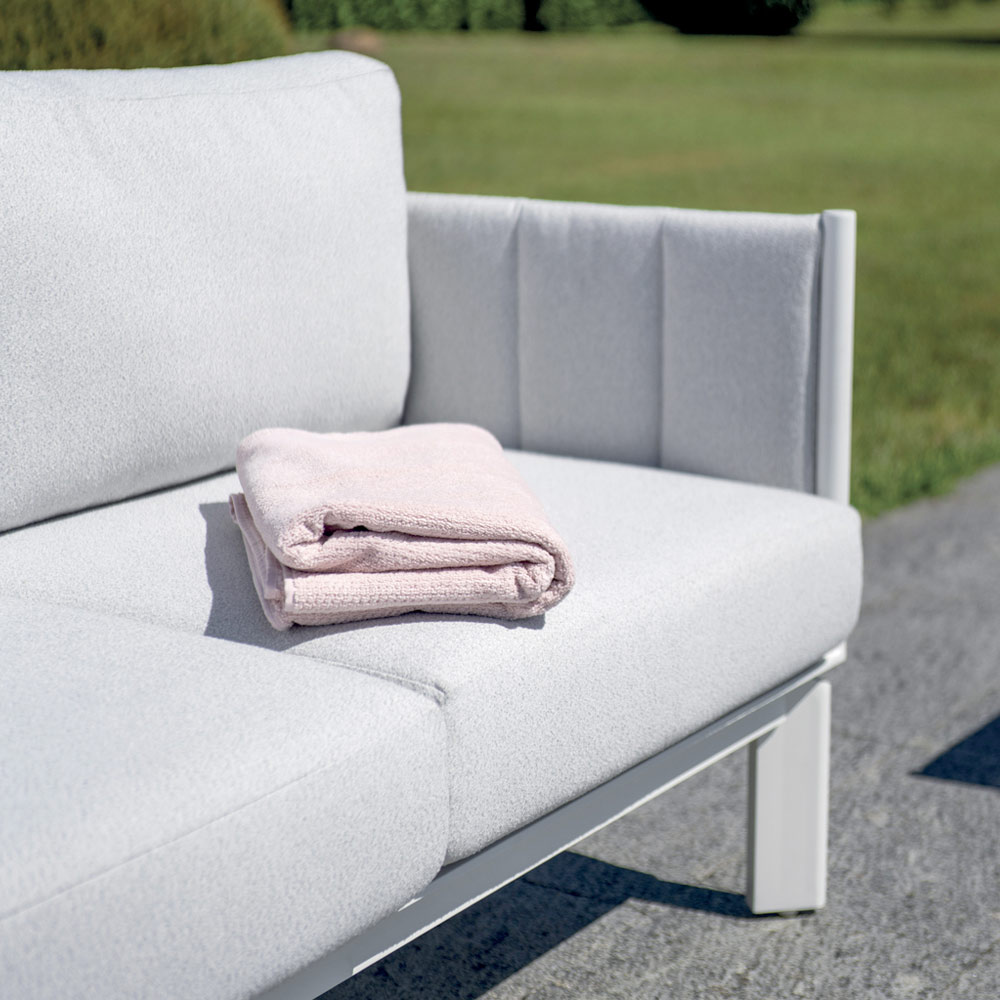 Rama albă din aluminiu conferă luminozitate și durabilitate, în timp ce căptușeala din material textil gri deschis adaugă o notă de moliciune și confort. Husele detașabile ale pernelor , de asemenea gri deschis, permit o întreținere rapidă și ușoară, menținând camera de zi mereu ordonată și impecabilă.