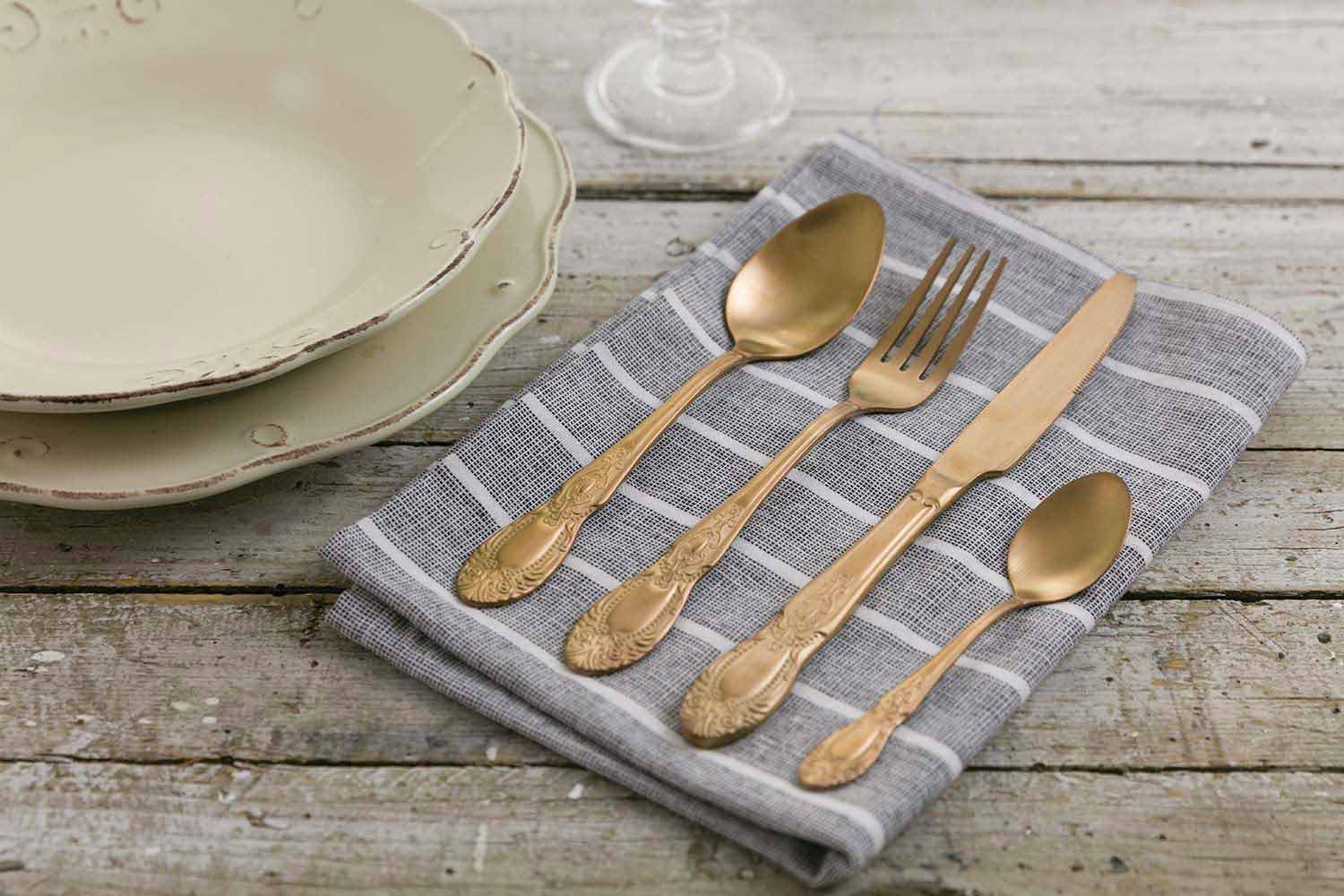 Un serviciu romantic, confecționat din oțel satinat cu somptuoase decorațiuni baroce pe mâner , pentru un efect rafinat într-un stil șict.
