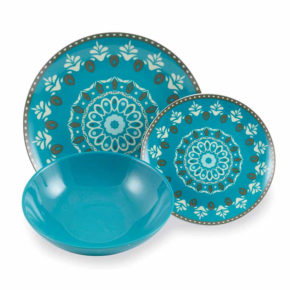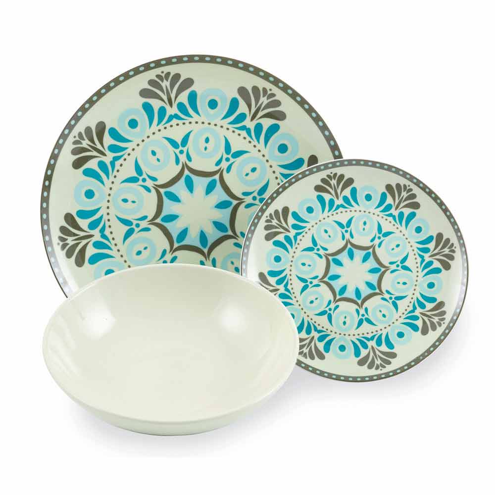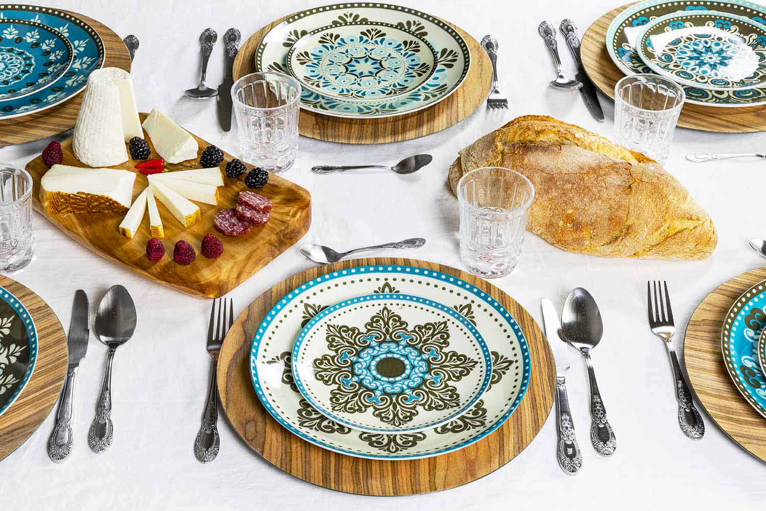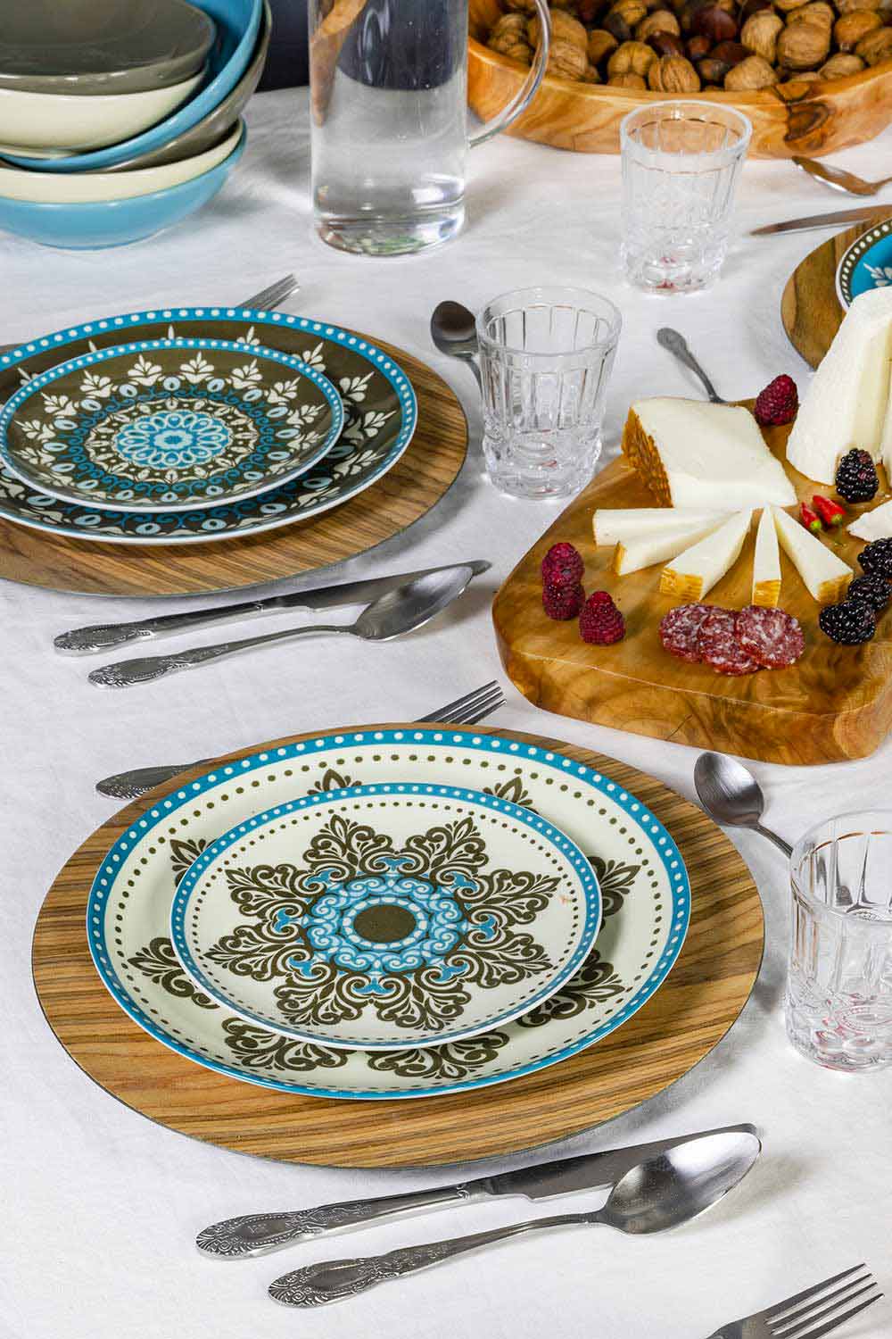 Eleganța și ușurința disting plăcile plate și plăcile de fructe, din porțelan alb fin pe care se aplică decalul; gresia glazurată a celor șase farfurii, pe de altă parte, aduce funcționalitate pe masă: