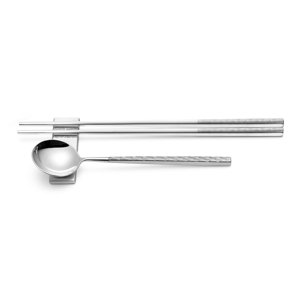Bețișoarele lungi și subțiri sunt concepute pentru o utilizare confortabilă și o prindere sigură, în timp ce lingura are o adâncime optimă pentru a sorbi cu ușurință bulion și sosuri. Elementul distinctiv este baza pătrată care servește drept suport pentru tacâmuri, asigurându-se că acesta rămâne întotdeauna curat și bine prezentat atunci când nu este folosit.