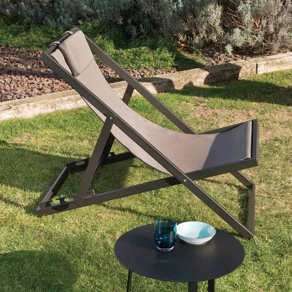 Şezlong de exterior cu structură din aluminiu vopsit cu pulbere epoxidice şi scaun din 2 piese din textilă.
