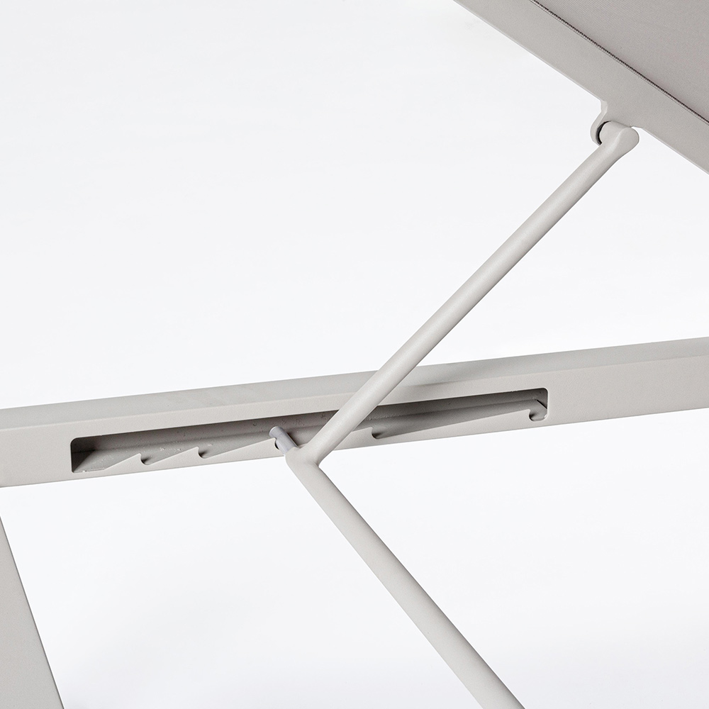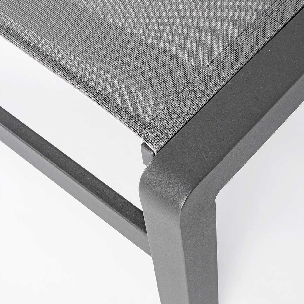 Structură din aluminiu acoperit cu pulbere (poliester). Scaun și spate din textilen 1x1. Roți din plastic și șuruburi din oțel inoxidabil. Spătar înclinat (6 poziții). Stivuibil.