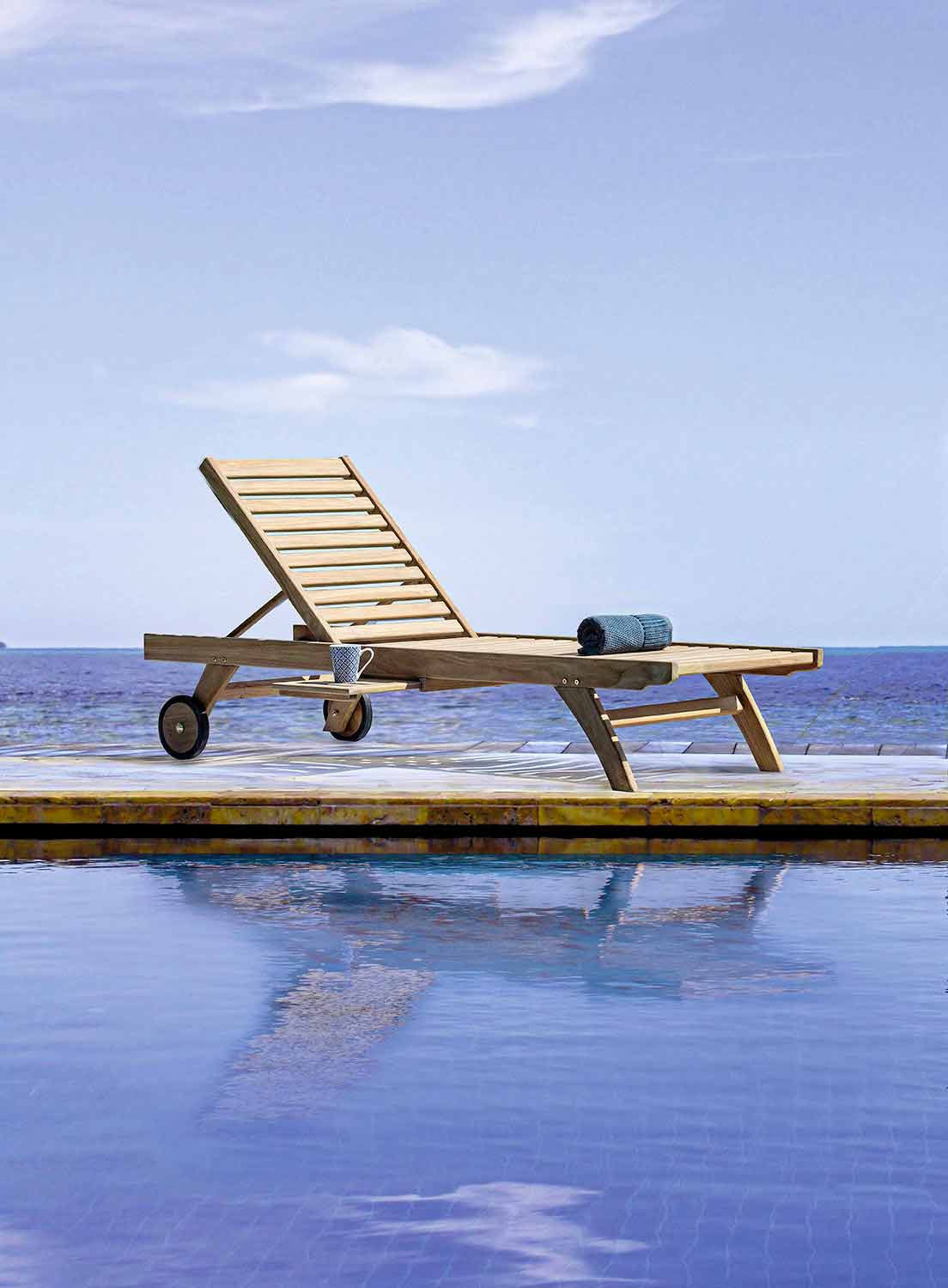Sezlong exterior cu roti, compartiment inclinat si depozitare din lemn de tec.