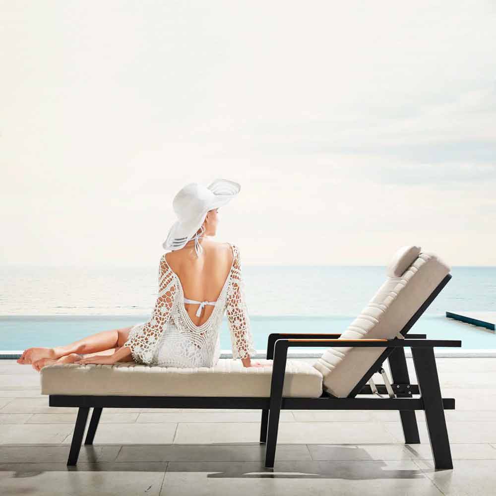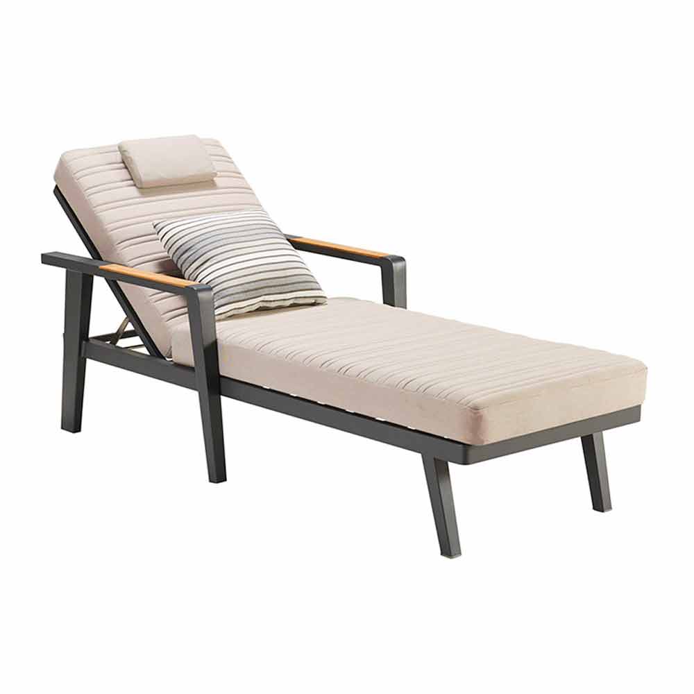 Acest șezlong se caracterizează printr-un design simplu, liniar și elegant. Are o structură din aluminiu acoperit cu pulbere de culoare antracit , cu cotiere de suprafață din lemn de tec.
