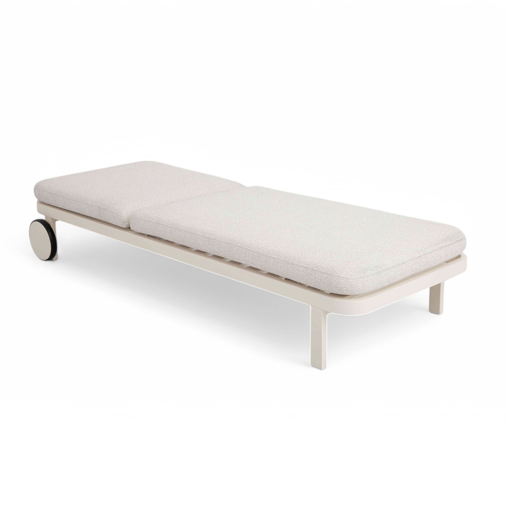 Designul minimalist este îmbogățit de detalii grijulii, cum ar fi roțile integrate care facilitează mutarea oriunde preferați, urmărindu-vă momentele de relaxare la soare sau la umbră. Salteaua adaptată , îmbrăcată în țesătură rezistentă la intemperii , garantează un confort extraordinar și durabilitate în timp.