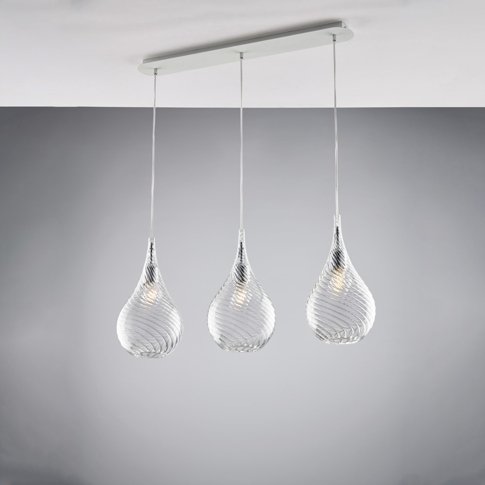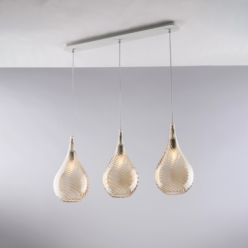 Elegant și funcțional, acest pendul din fier forjat, lucrat manual, cu sticlă Pyrex, este o soluție de iluminat contemporană, concepută pentru a îmbunătăți spațiile cu echilibru și luminozitate. Cele trei difuzoare sinuoase și rafinate din sticlă Pyrex sunt suspendate pe o șină liniară care asigură o distribuție uniformă a luminii și un impact estetic puternic.