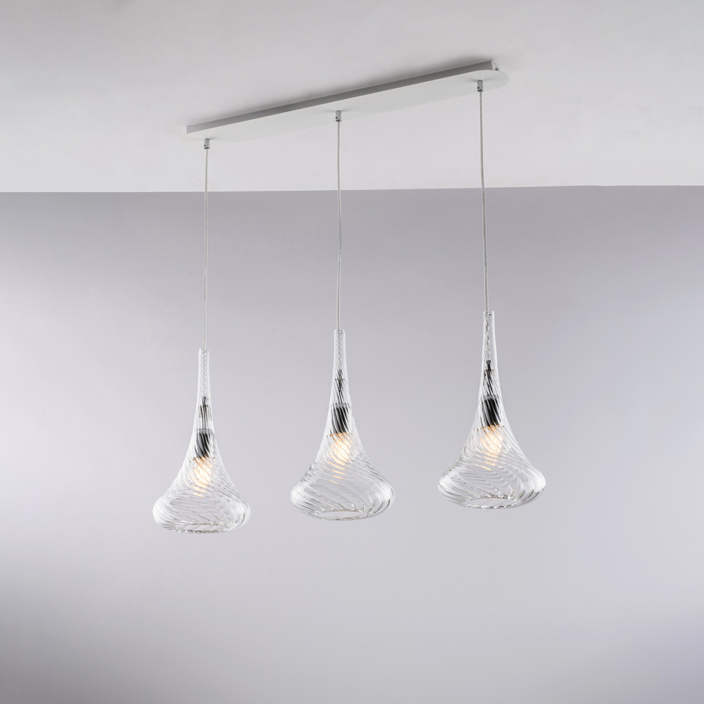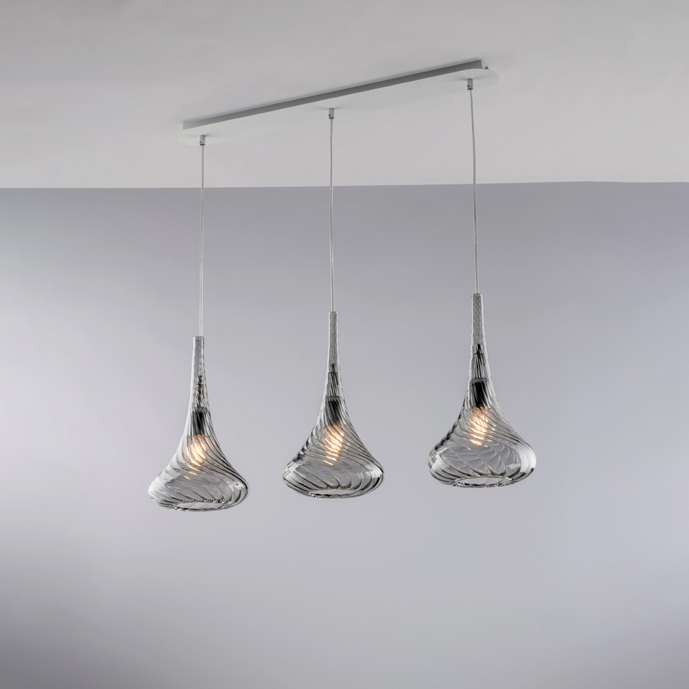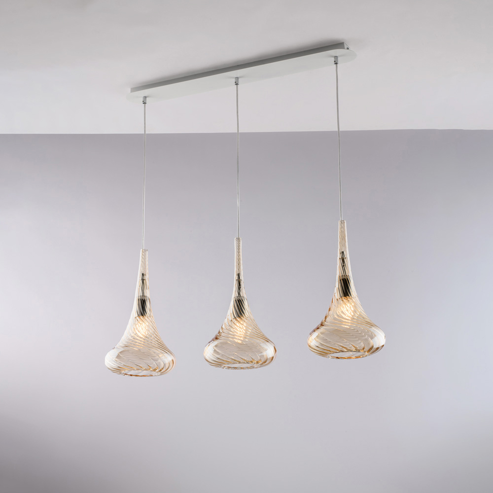 Disponibilă în finisaje Transparent , Chihlimbar sau Gri , această lampă suspendată vă permite să personalizați atmosfera spațiului dvs.: luminoasă și minimalistă în versiunea transparentă, caldă și învăluitoare în chihlimbar, elegantă și modernă în gri. Este perfectă pentru insule de bucătărie , mese de sufragerie , blaturi , spații deschise și medii contractuale de design .