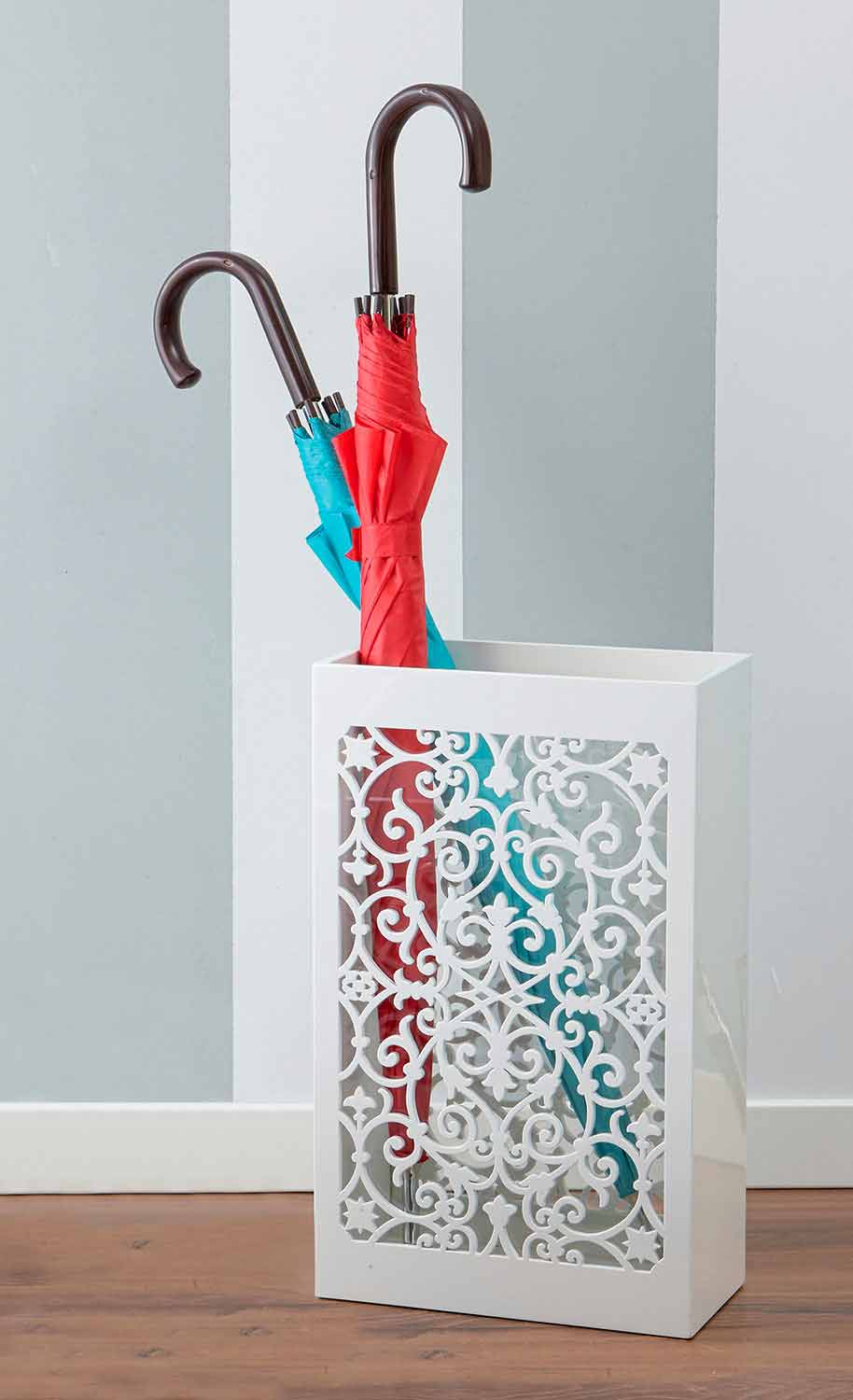 Stand de umbrele de podea din lemn alb, pietris, gri porumbel sau nisip, cu un design modern decorat cu fluturi, realizat în Italia.