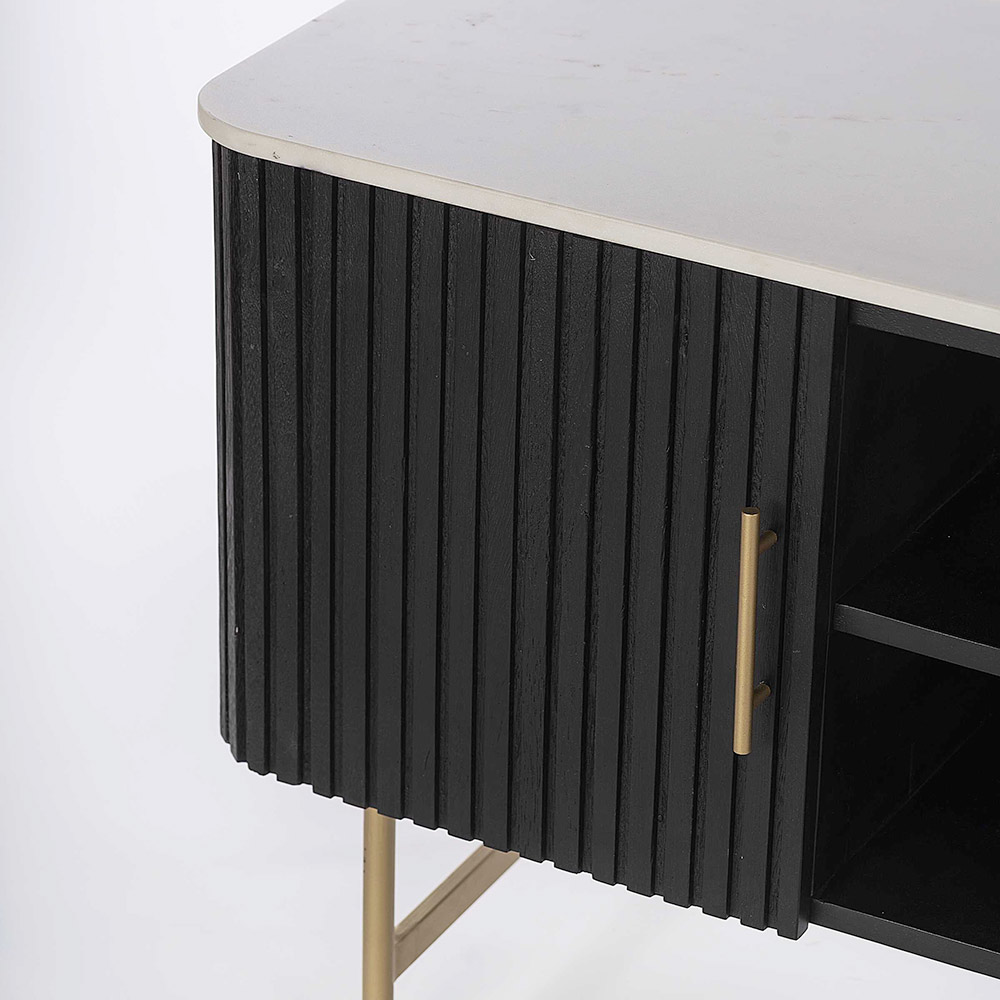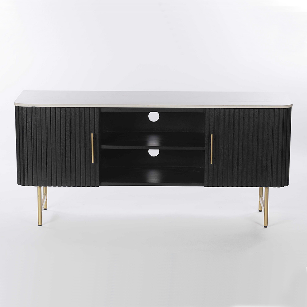 Acest Stand TV este esența eleganței contemporane, combinând designul modern și funcționalitatea . Cadrul negru din lemn canelat oferă un efect tridimensional sofisticat, perfect echilibrat de tabloul neted care adaugă o notă rafinată. Picioarele subțiri, dar robuste, din metal auriu conferă lejeritate vizuală și asigură stabilitate.