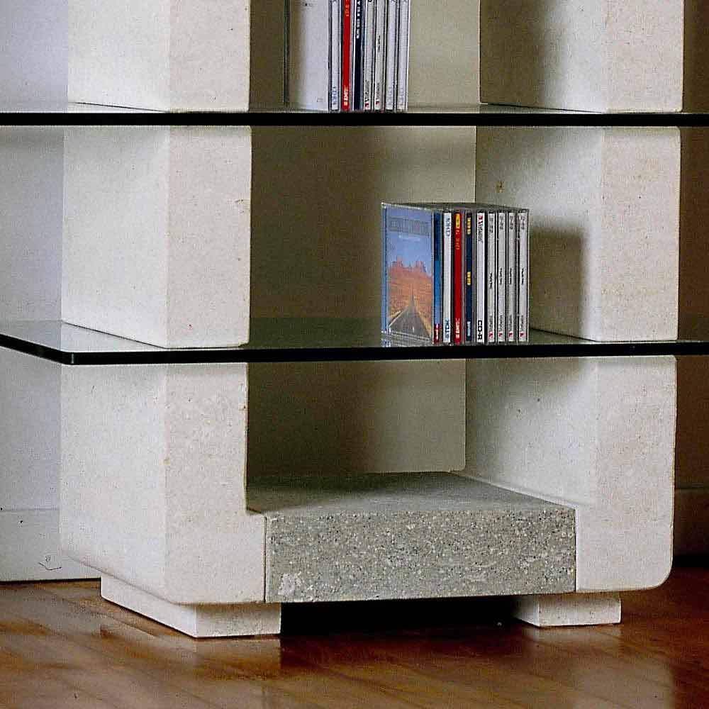 Modulară ușă hi-fi Realizată în Italia , realizată din combinație de piatră Vicenza albă și gri și rafturi de sticlă de 12 mm grosime. Esența formei și combinația materialelor îl fac un obiect modern și funcțional adecvat pentru mobilierul minimalist. Pietrele sunt tratate cu o apă de impregnare lavabilă și ecologică pentru curățarea ușoară.