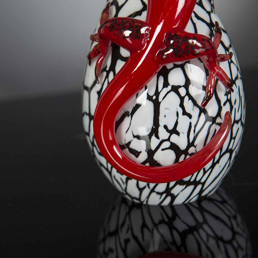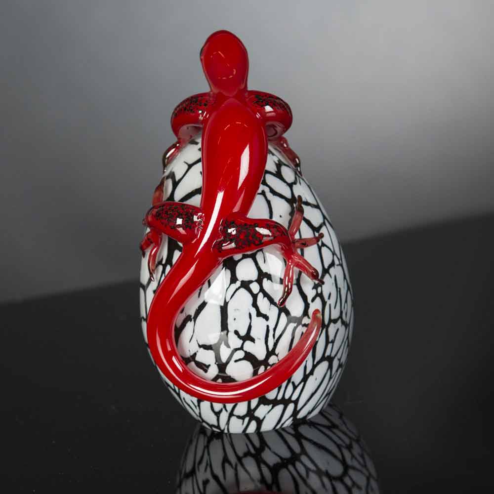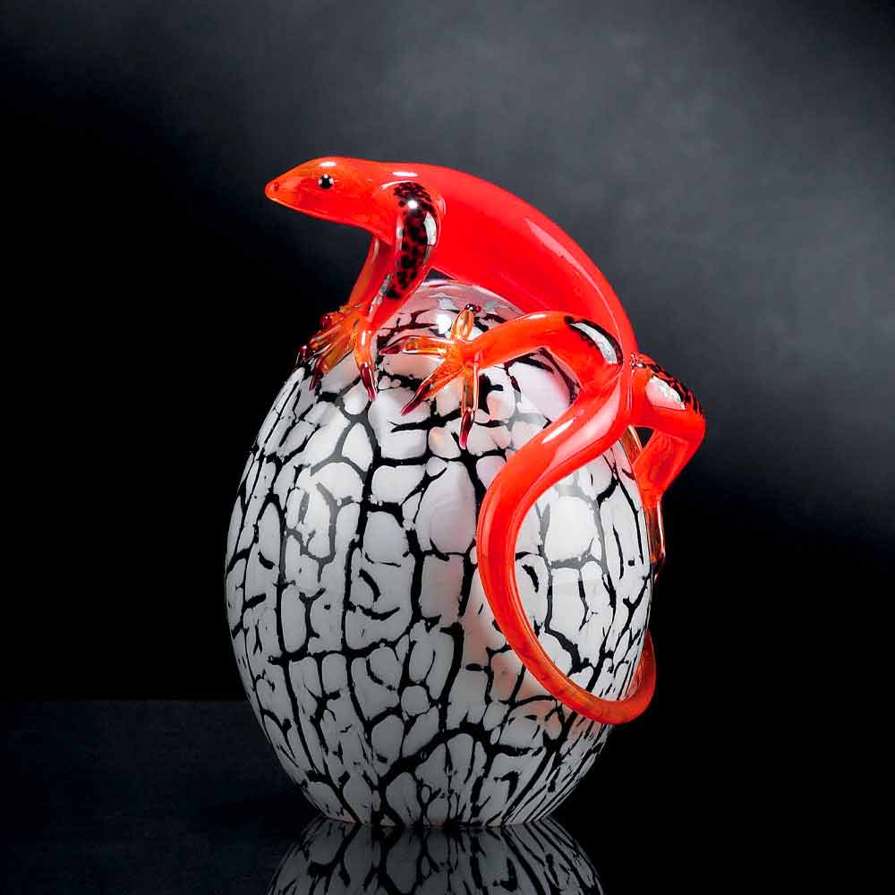 Statuie în formă de ou cu gecko realizată în Italia în sticlă albă, neagră și roșie . Un element decorativ excentric pentru spațiile de acasă capabil să dea o notă originală datorită personalității sale creative puternice . Estetica sa neobișnuită și colorată reprezintă, fără îndoială, punctul forte, făcându-l o idee perfectă pentru cei cărora le place să îmbogățească mediul de acasă într-un mod original și elegant, în același timp, datorită unui obiect subliniat de linii exclusive și eleganței atemporale a sticlei și culorile sale minunate. Rezultatul este un accesoriu decorativ simplu pentru casă capabil să îmbogățească stilul oricărei case cu o notă de culoare datorită sufletului său modern și designului avangardist .