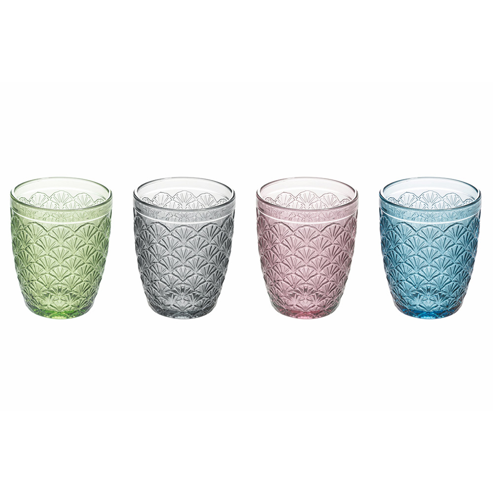 Set de pahare de apă din sticlă colorată și decor de frunze, 12 bucăți.