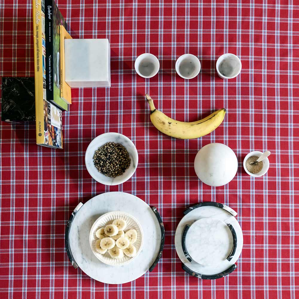 Sticlă grappa caracterizată prin marmură albă de Carrara calitate înaltă utilizată pentru realizarea sa. Este o piesă unică, deoarece fiecare bloc de marmură este diferit în vene și nuanțe. Marmura utilizată pentru realizarea produsului provine din cariera Poggio Silvestre, care este o sursă de marmură albă de prima calitate clasificată încă din secolul trecut.