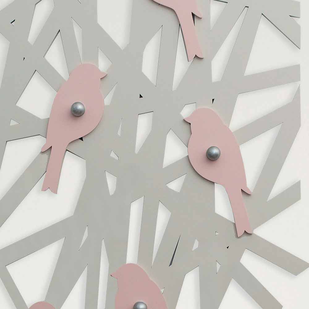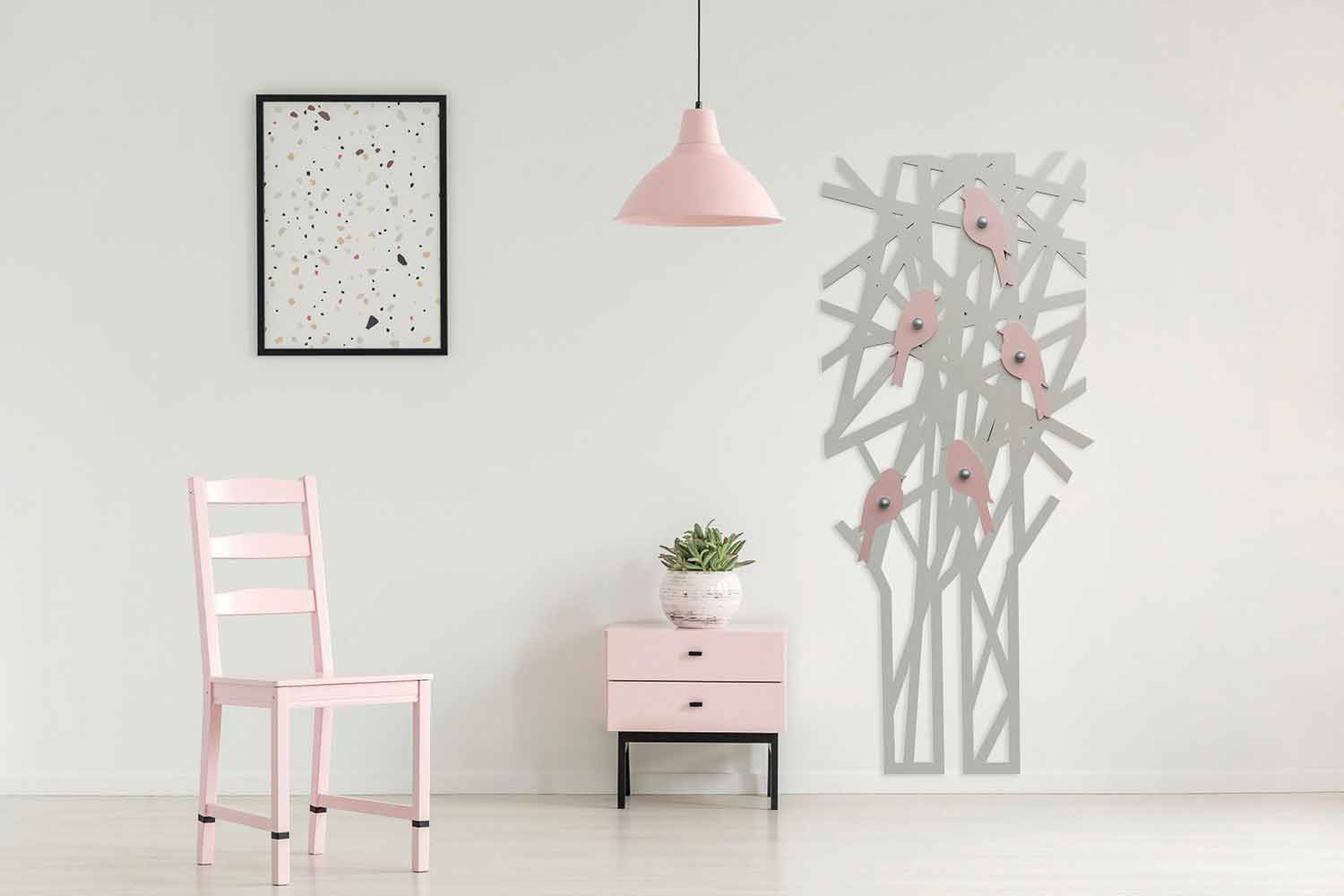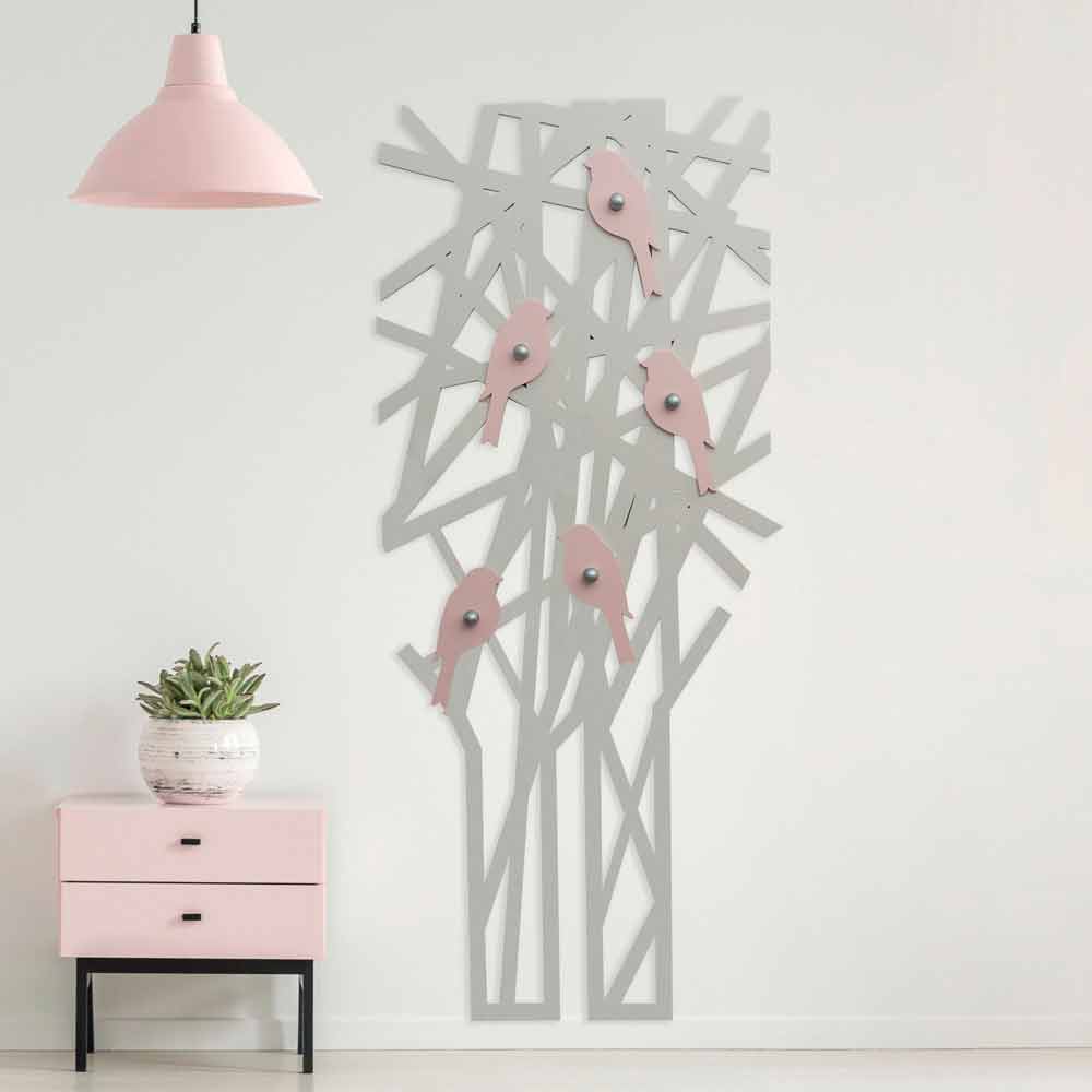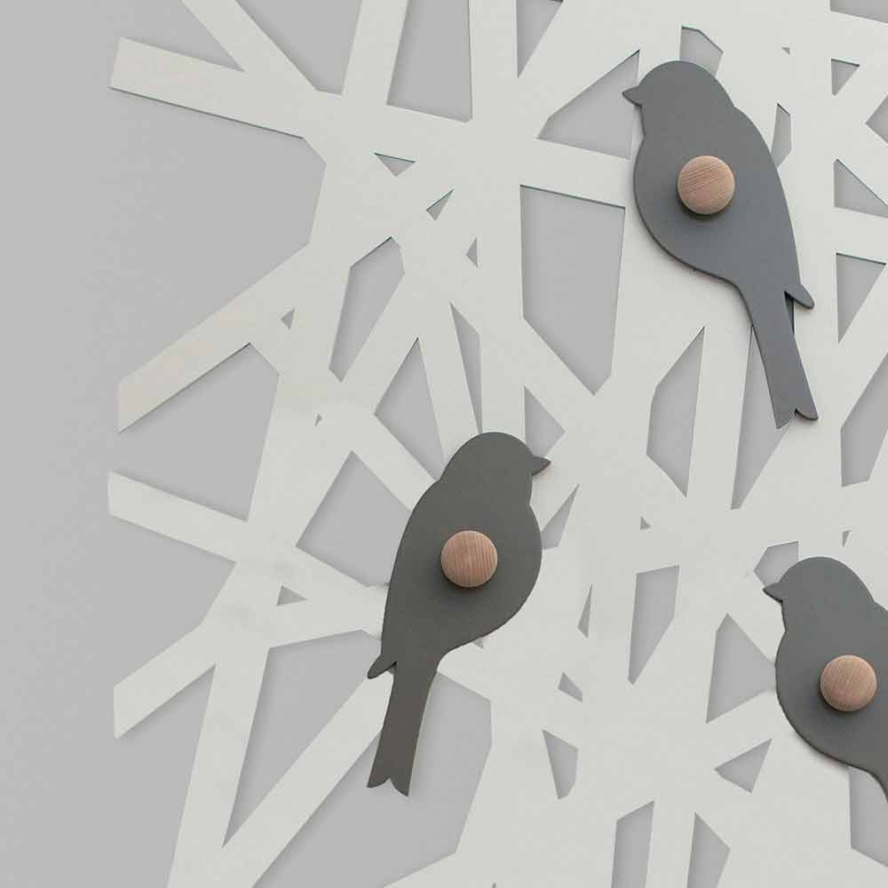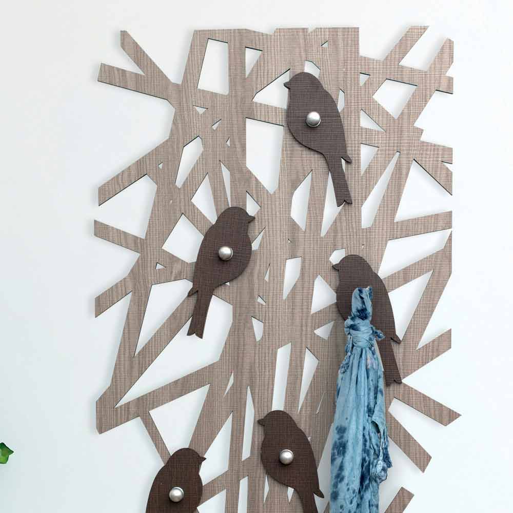 Cuier de perete pentru intrare, design modern în formă de copac stilizat cu păsări, realizat în Italia.