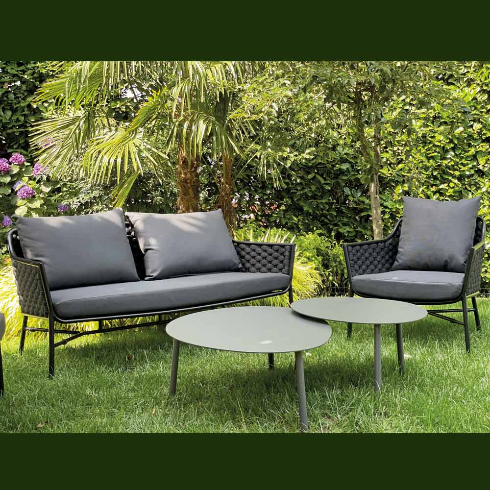 Acest lounge de grădină este o adevărată invitație la relaxare, unde designul elegant și materialele tehnice se întâlnesc pentru a crea un colț exterior rafinat și primitor. Structura din aluminiu vopsit negru confera soliditate si o estetica contemporana, perfect in acord cu tendintele mobilierului de exterior high-end.