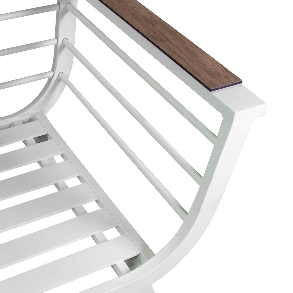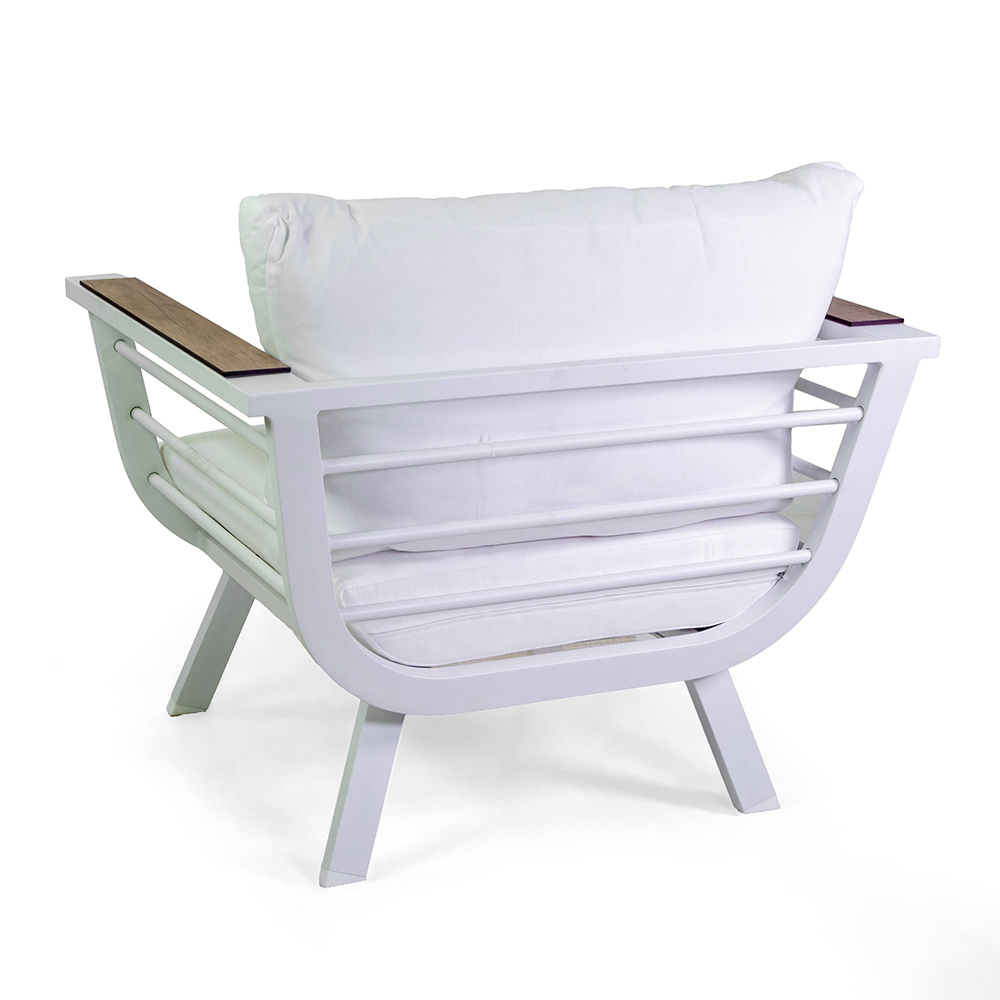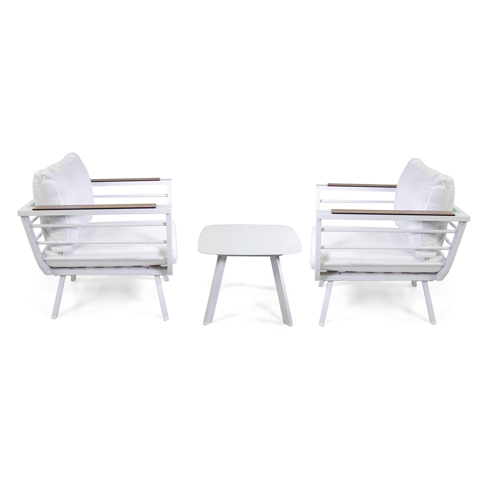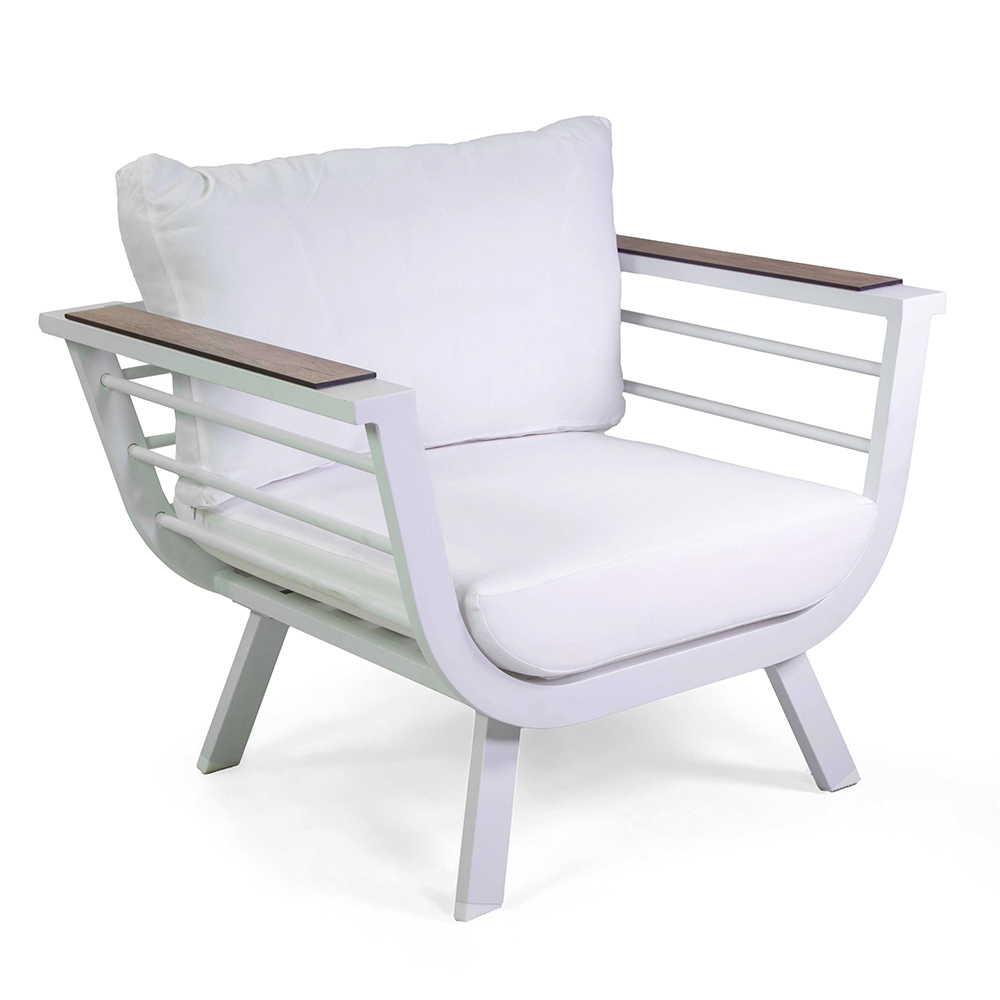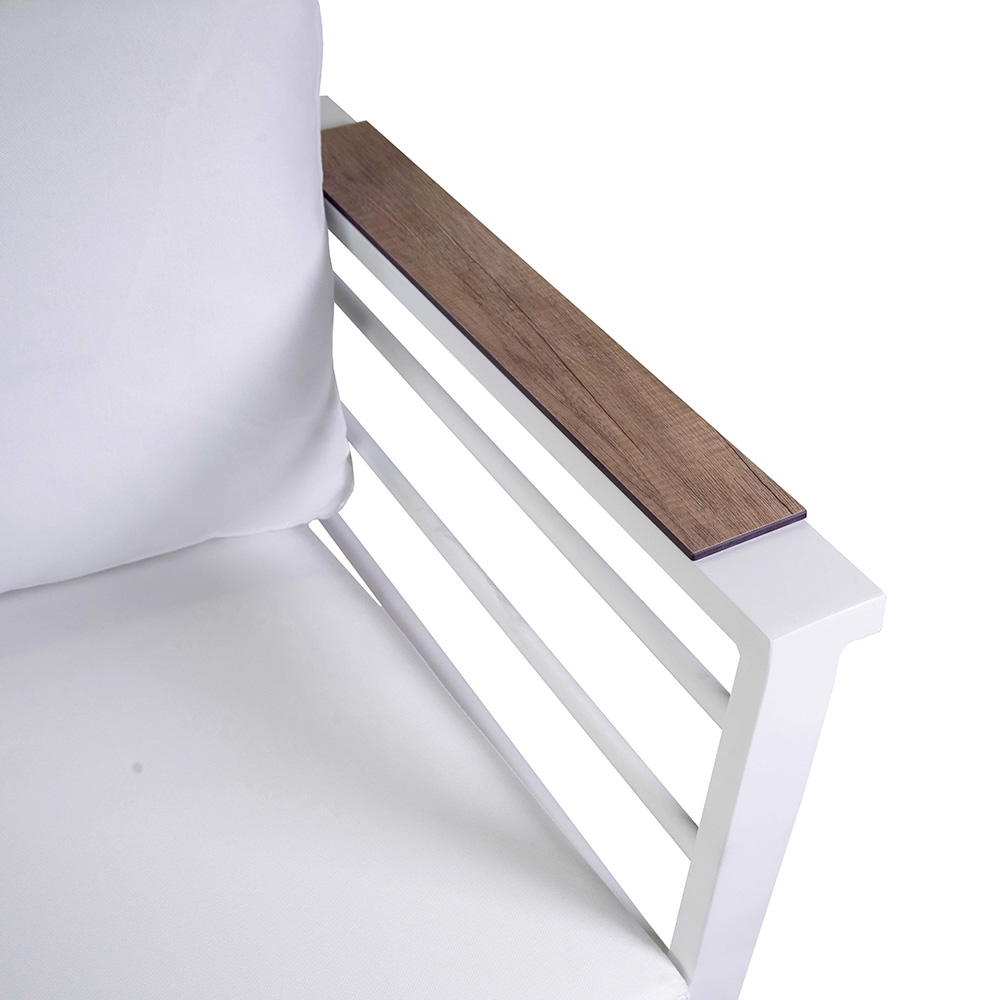 Descoperiți eleganța modernă și confortul cu acest set de lounge din aluminiu acoperit cu pulbere alb . Perfect pentru a adăuga o notă de clasă spațiului dvs. în aer liber, acest set include două fotolii cu perne detașabile de 12 cm grosime din țesătură Olifen 100% repelentă la apă, asigurând confort și durabilitate. Inserțiile HPL pentru cotiere adaugă o notă de stil și funcționalitate, în timp ce masa albă aluminiu -top este robustă și ușor de întreținut.