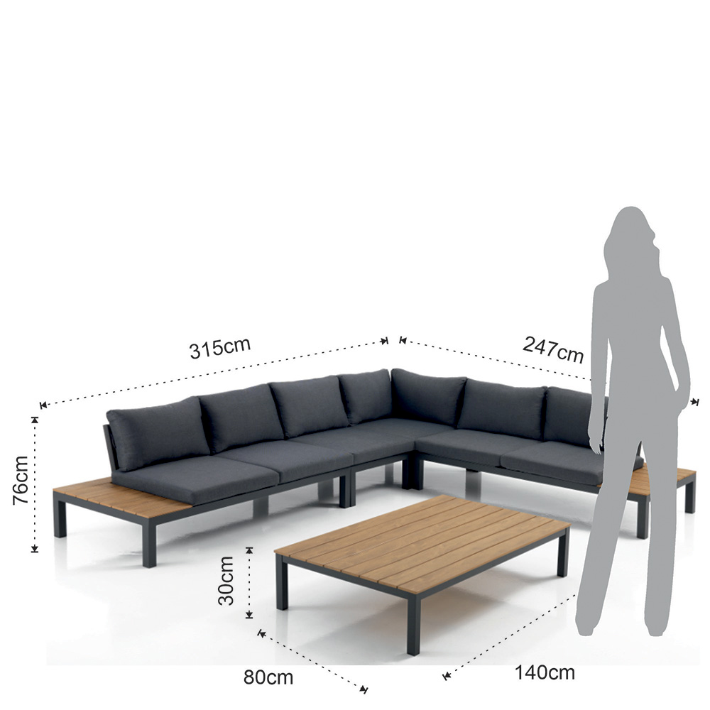 Această canapea de colț cu măsuță de cafea pentru grădină este exemplul de lux modern în aer liber . Combinația dintre structurile robuste din aluminiu și utilizarea polywood pentru detaliile măsuței de cafea și capetele canapelei creează un contrast vizual elegant și sofisticat . Pernele groase și confortabile oferă o experiență de relaxare primitoare și relaxantă , perfectă pentru după-amiezi lungi de petrecere a timpului liber sau pentru serile de socializare sub stele.