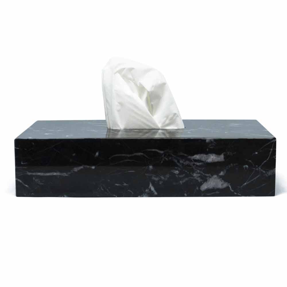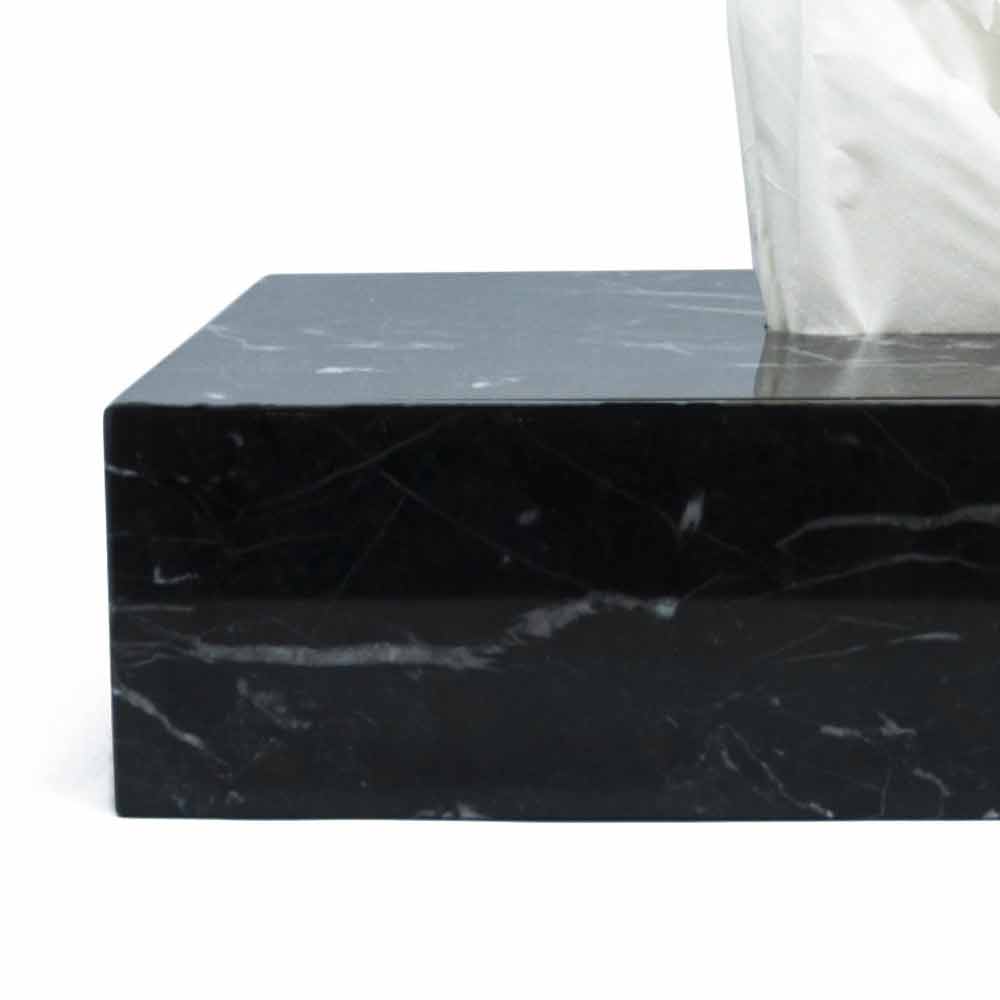 Container practic pentru suport de țesut disponibil în versiunea dreptunghiulară realizată în întregime din marmură neagră Marquinia realizată manual de profesioniști specializați. Este o piesă unică , deoarece fiecare bloc de marmură utilizat diferă de celelalte în ceea ce privește venele și nuanțele.